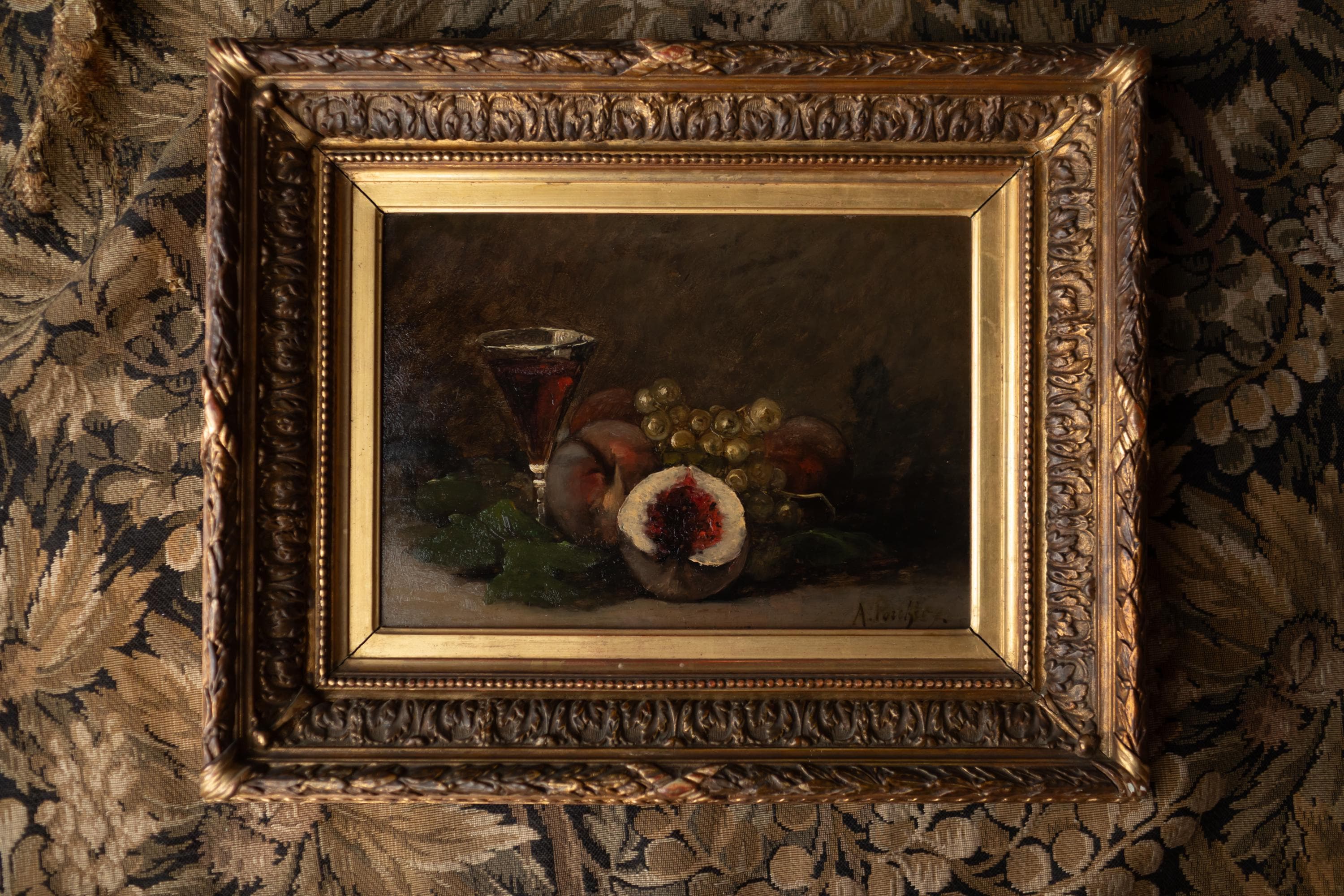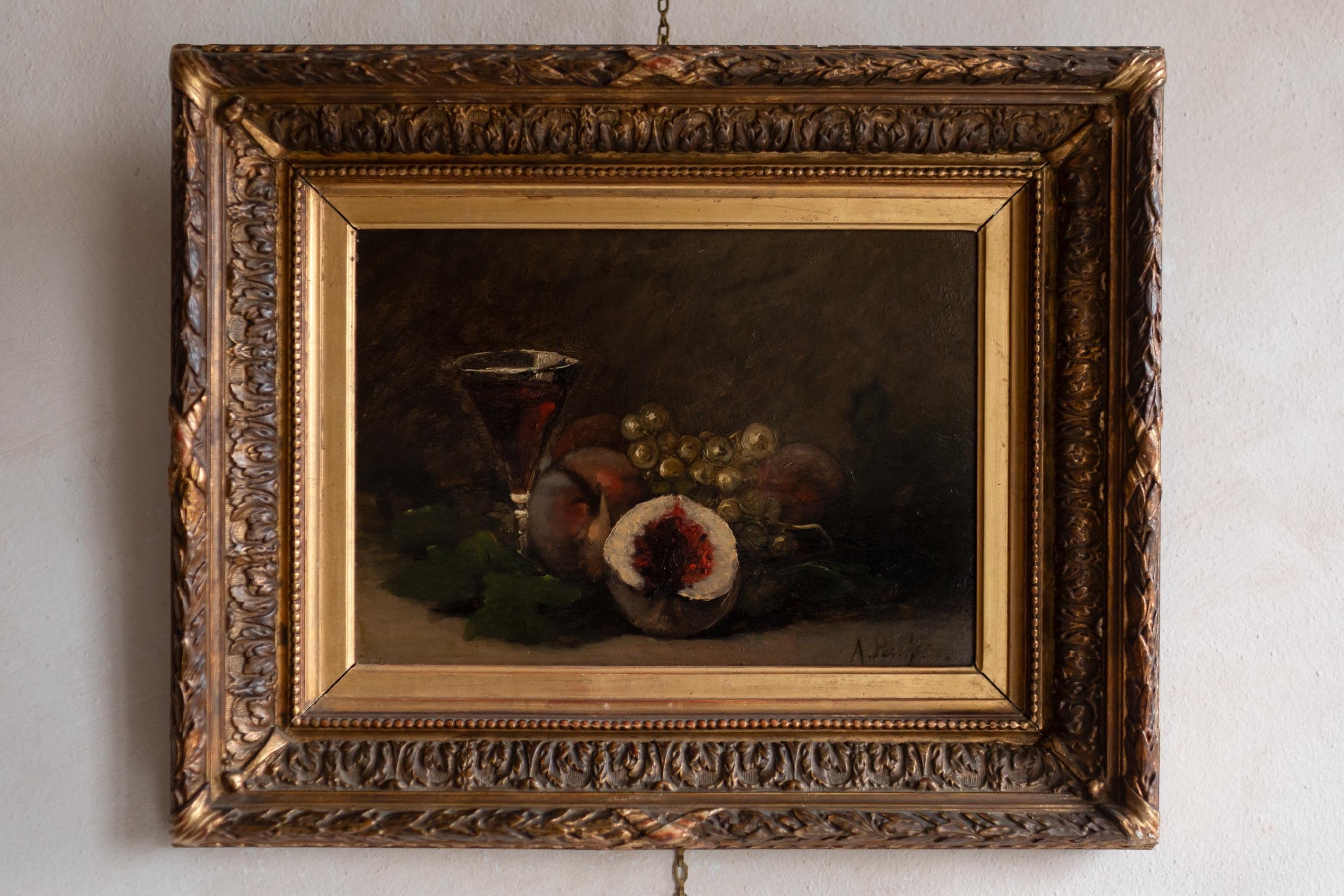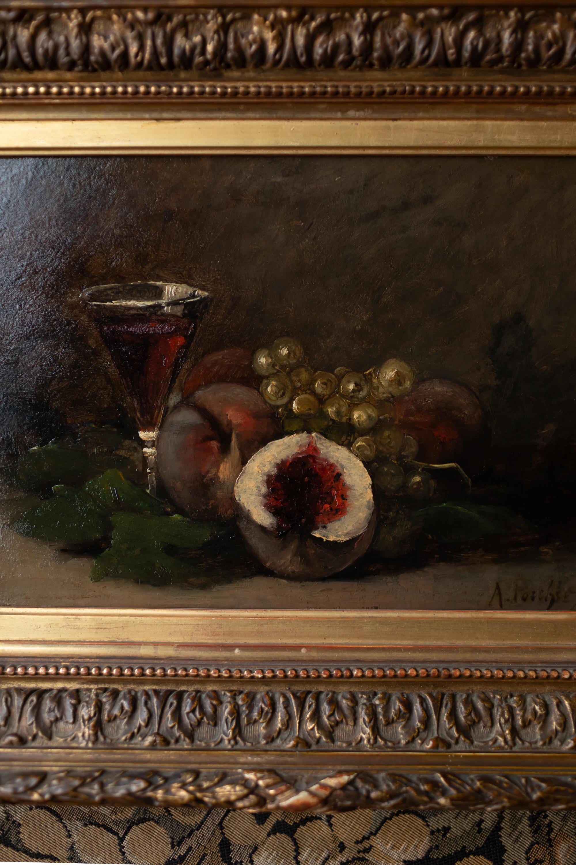 A refined 19th-century French still life by Charles Albert Porcher (1834–1895), depicting fruit and a glass of red wine against a rich dark ground. Recently professionally cleaned and revarnished, this elegant oil painting is presented in its period gilt frame.