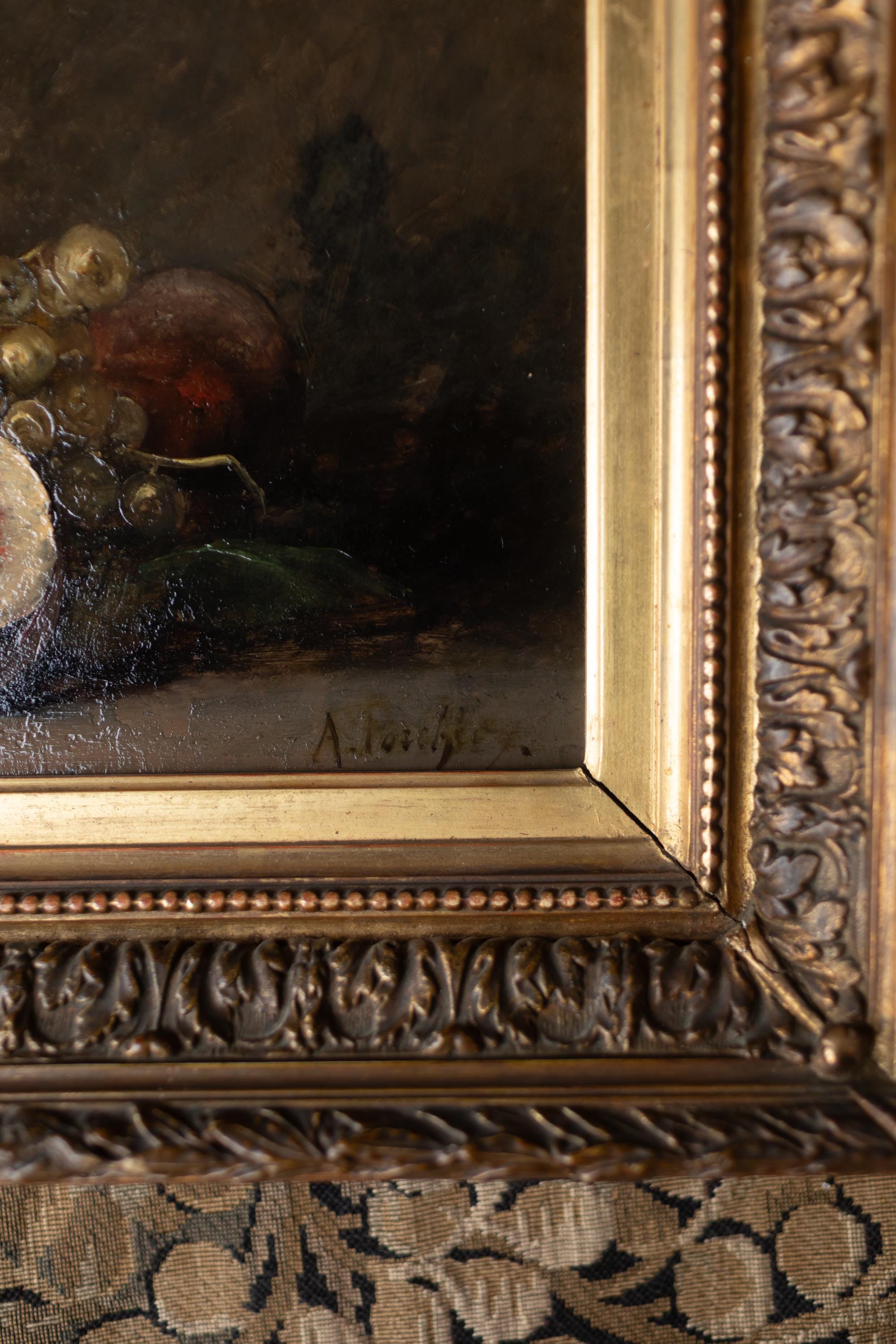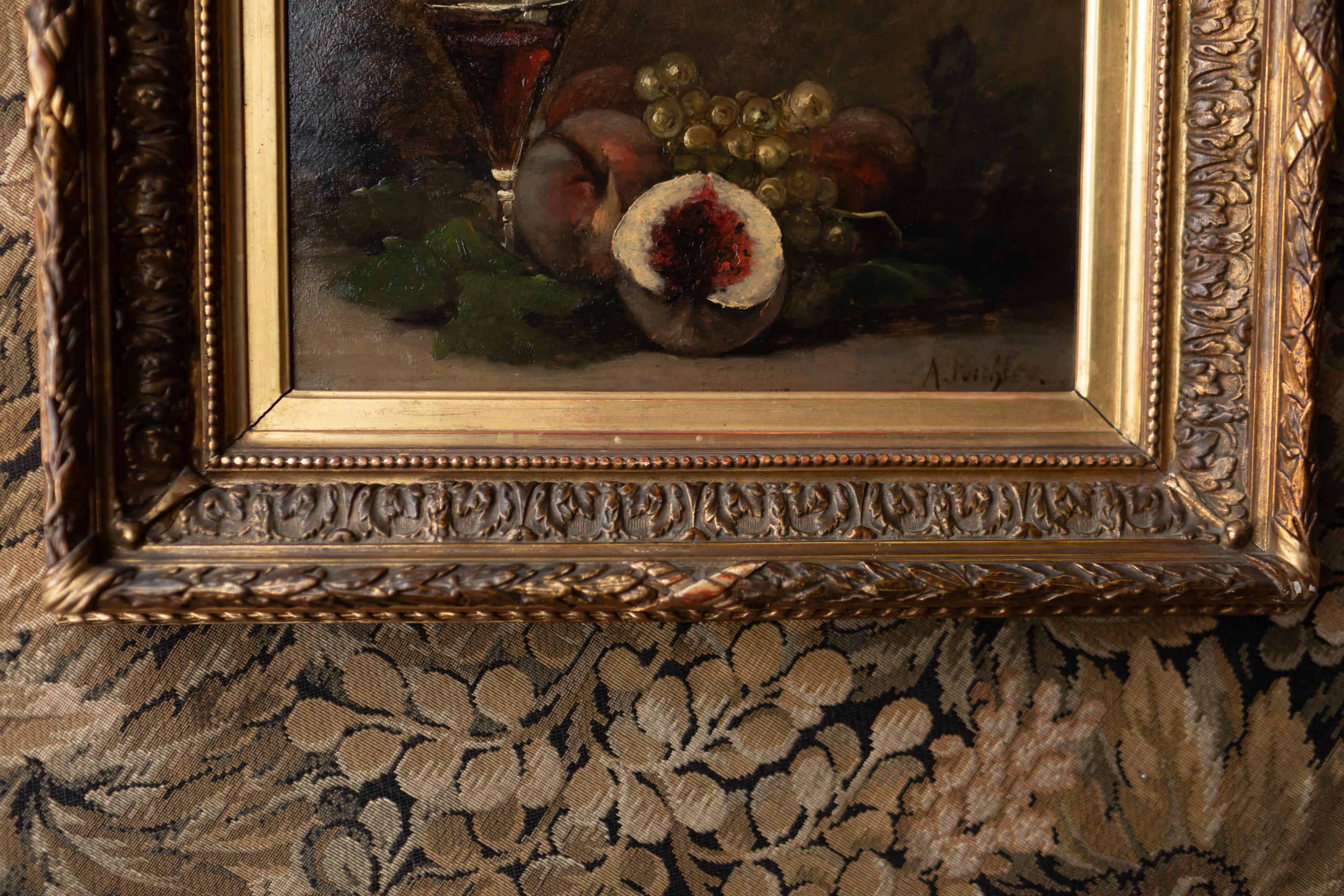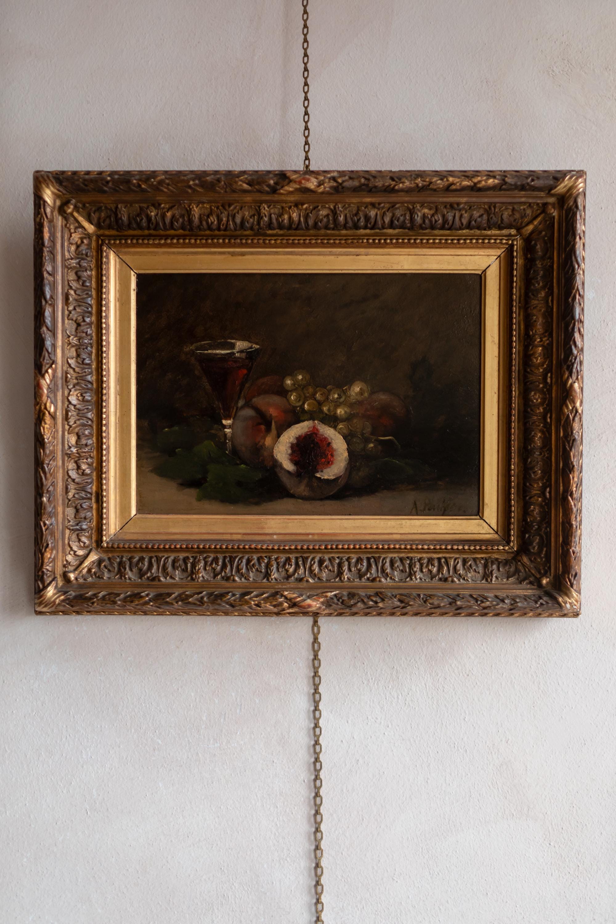 A refined 19th-century French still life by Charles Albert Porcher (1834–1895), depicting fruit and a glass of red wine against a rich dark ground. Recently professionally cleaned and revarnished, this elegant oil painting is presented in its period gilt frame.