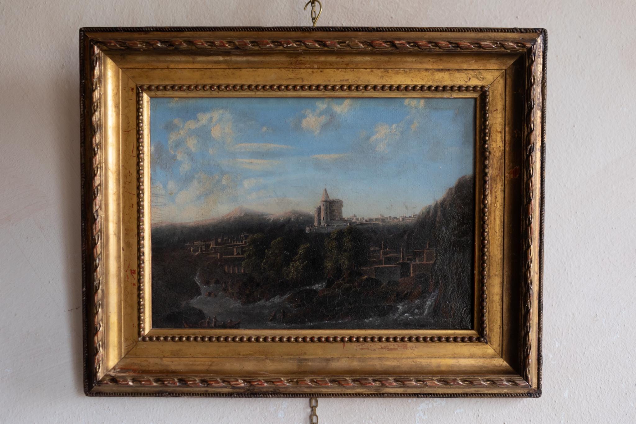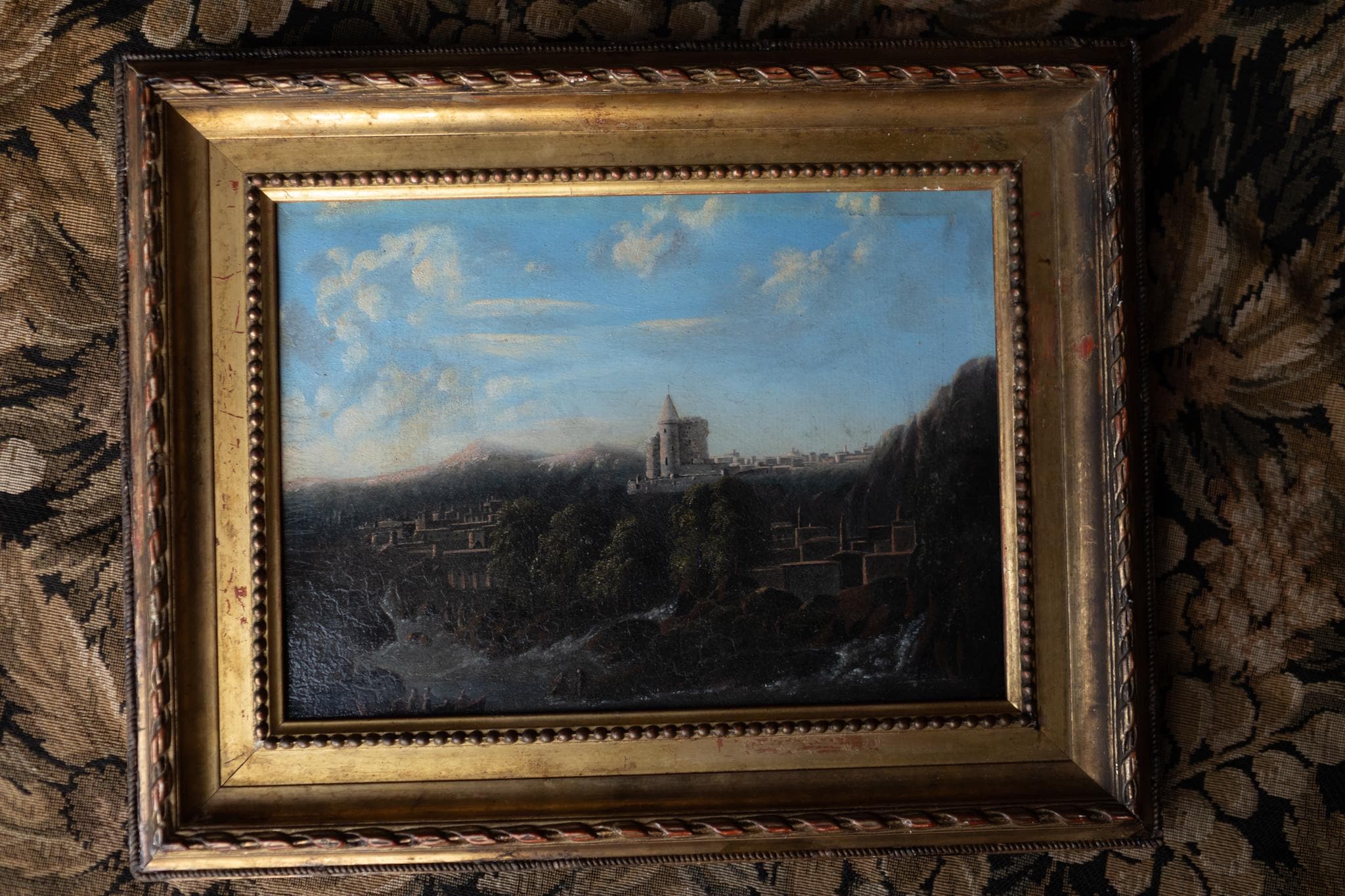 An evocative antique French landscape painting depicting a hilltop town and river valley with a stone bridge and distant mountains. This beautifully atmospheric oil on canvas dates from the early to mid 19th century and reflects the Romantic vision of southern France .