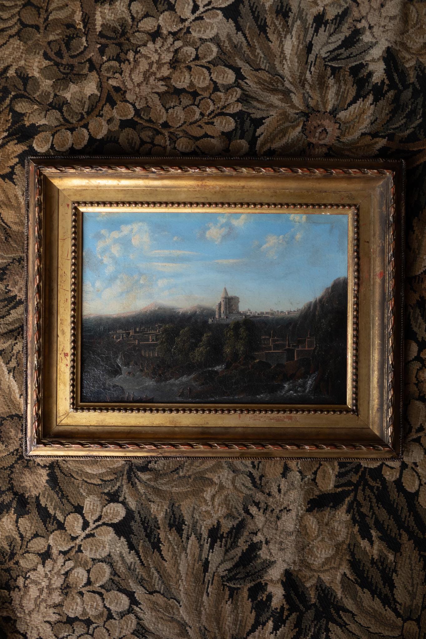 This finely detailed antique landscape captures a fortified town perched above a river, bathed in soft evening light. A tall central tower rises above the surrounding buildings while a bridge crosses the valley below. The artist has rendered the scene with subtle light, deep perspective, and rich tonal contrast — hallmarks of early 19th century Romantic French landscape painting. Possibly depicting a view of southern France, in the Provence area or perhaps the Rhône valley. The work combines natural drama with architectural harmony. Its serene sky and layered perspective create a captivating sense of distance and mood.