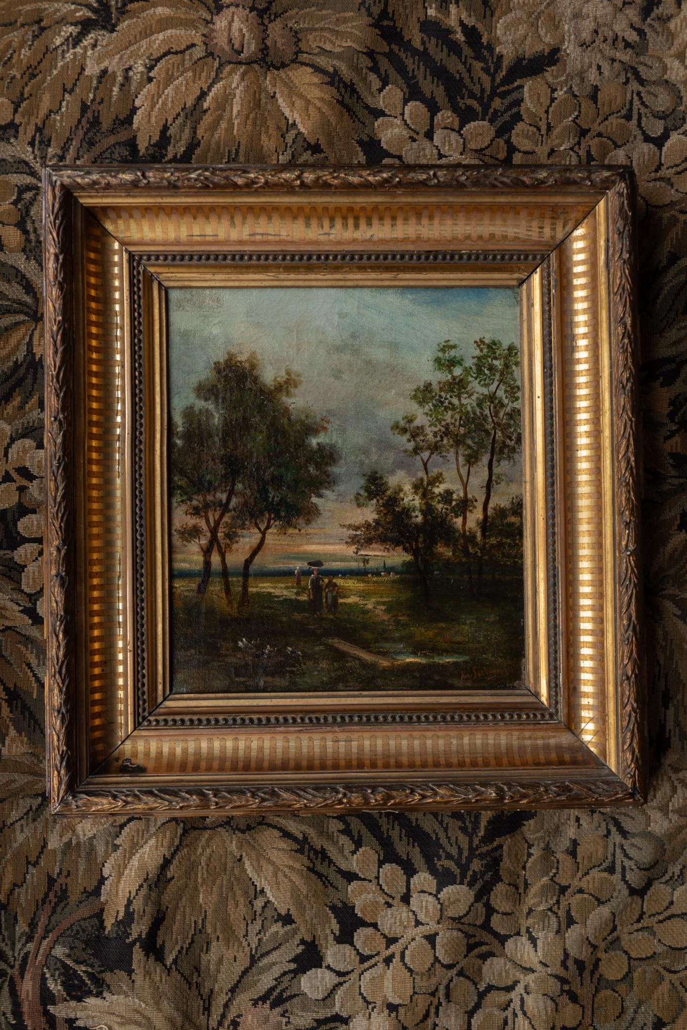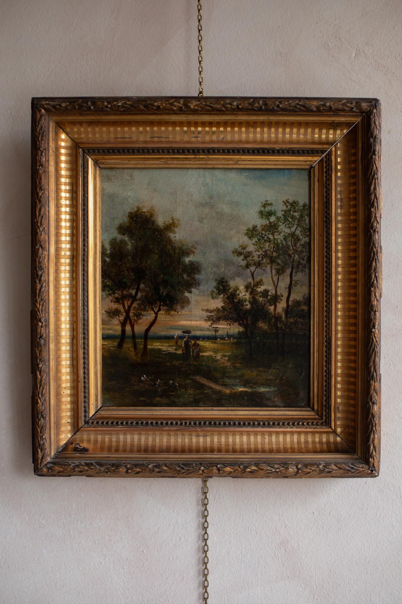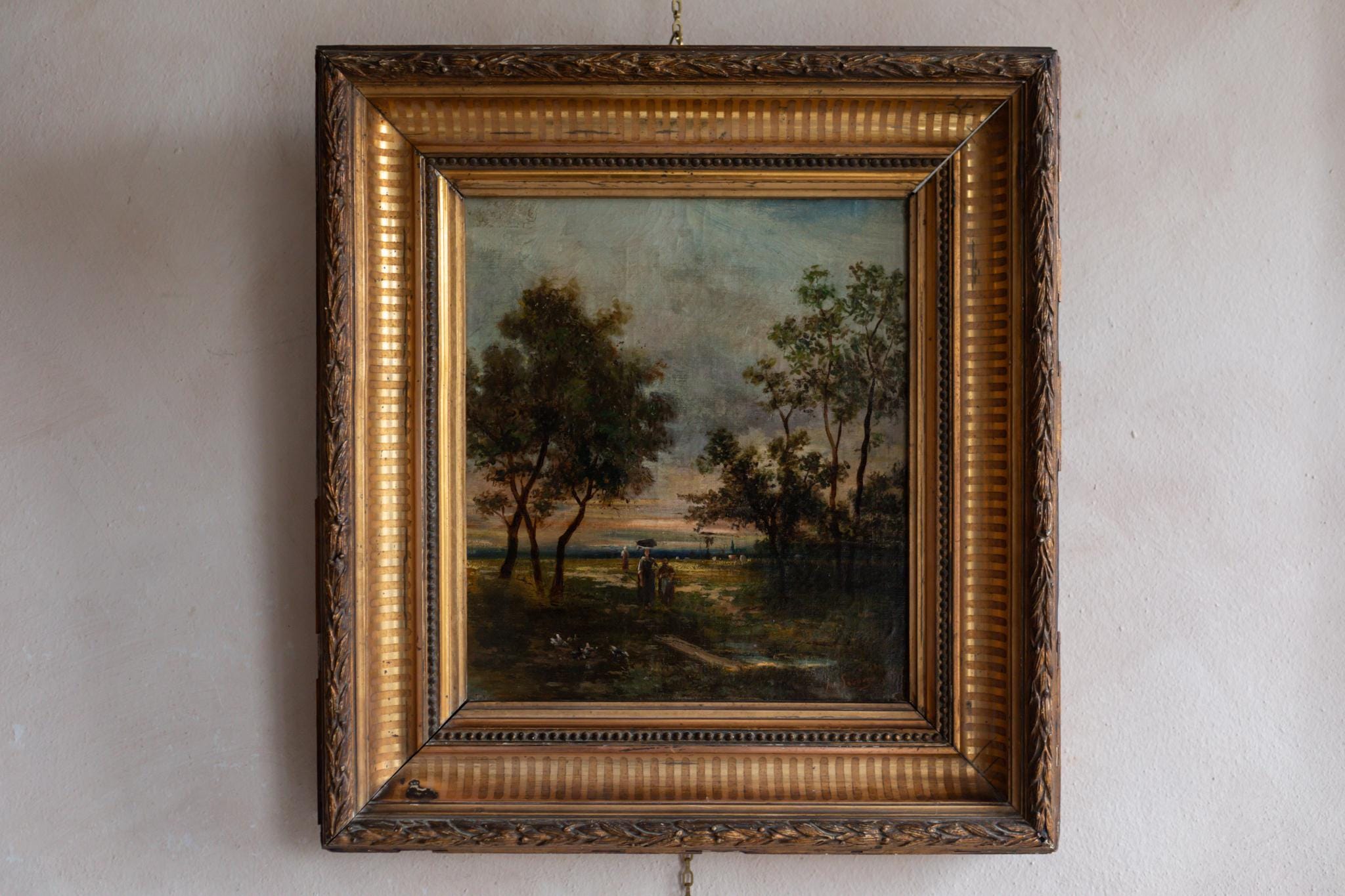 A beautiful Barbizon School landscape dated 1881, painted with rich atmosphere and soft evening light. Signed by the artist (name illegible), this work captures the poetic, naturalistic style that defined French landscape painting in the second half of the 19th century.