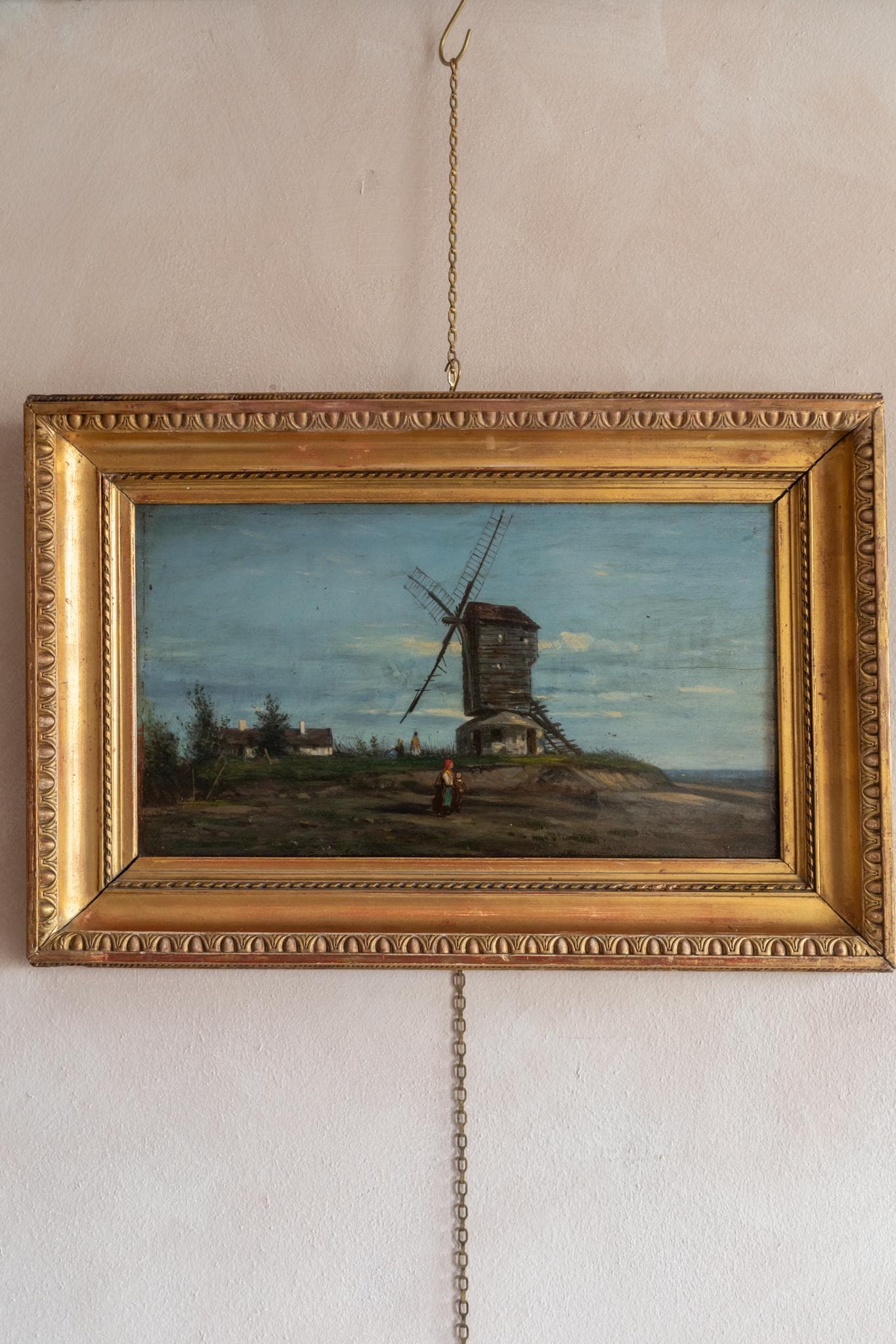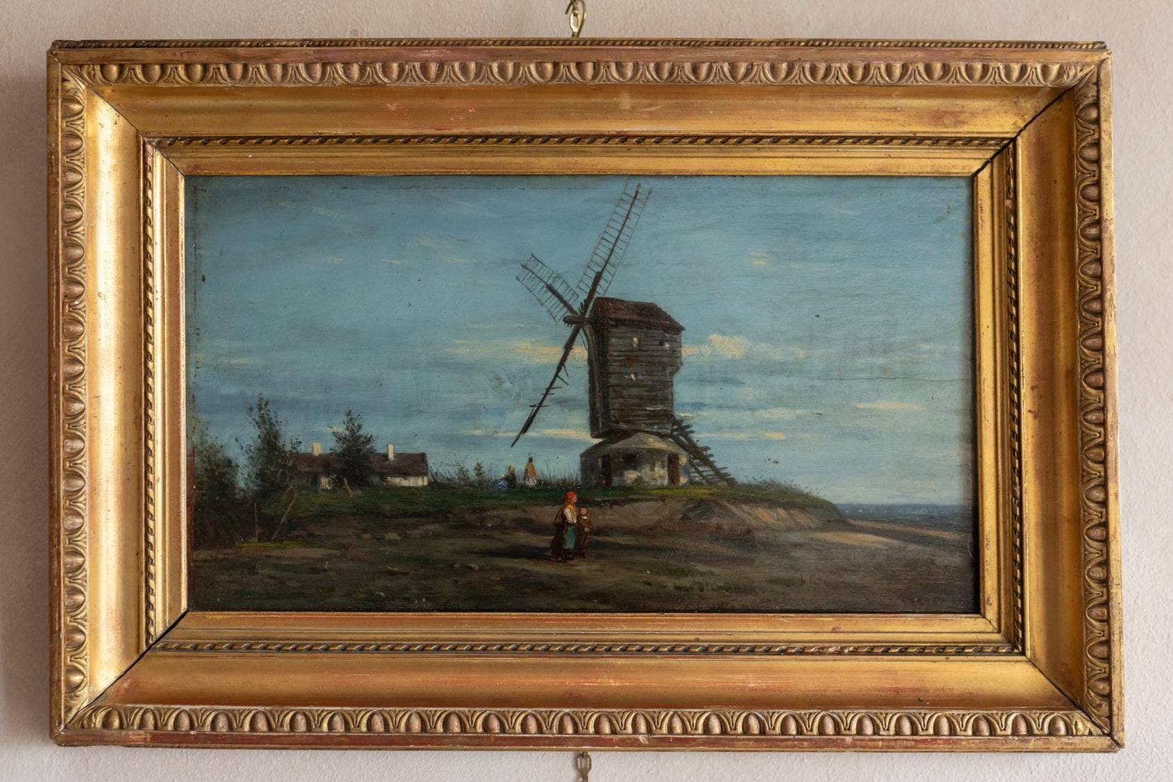 A charming antique Flemish oil painting depicting a traditional wooden post windmill set on a gentle rise in the countryside. The work is housed in a decorative gilt frame that complements the warm tones of the painting beautifully. This atmospheric antique landscape shows a classic wooden post windmill, a form of mill widely used throughout the Belgium and northern France during the 18th and 19th centuries. The mill stands elevated on a small mound to catch the wind, with its sails angled dramatically against a wide sky. The painter used soft tonal colours and loose brushwork to create depth in the sky and landscape. The overall palette of blues, earth tones, and greens gives the work a tranquil mood typical of Northern European landscape painting of the late 19th century.