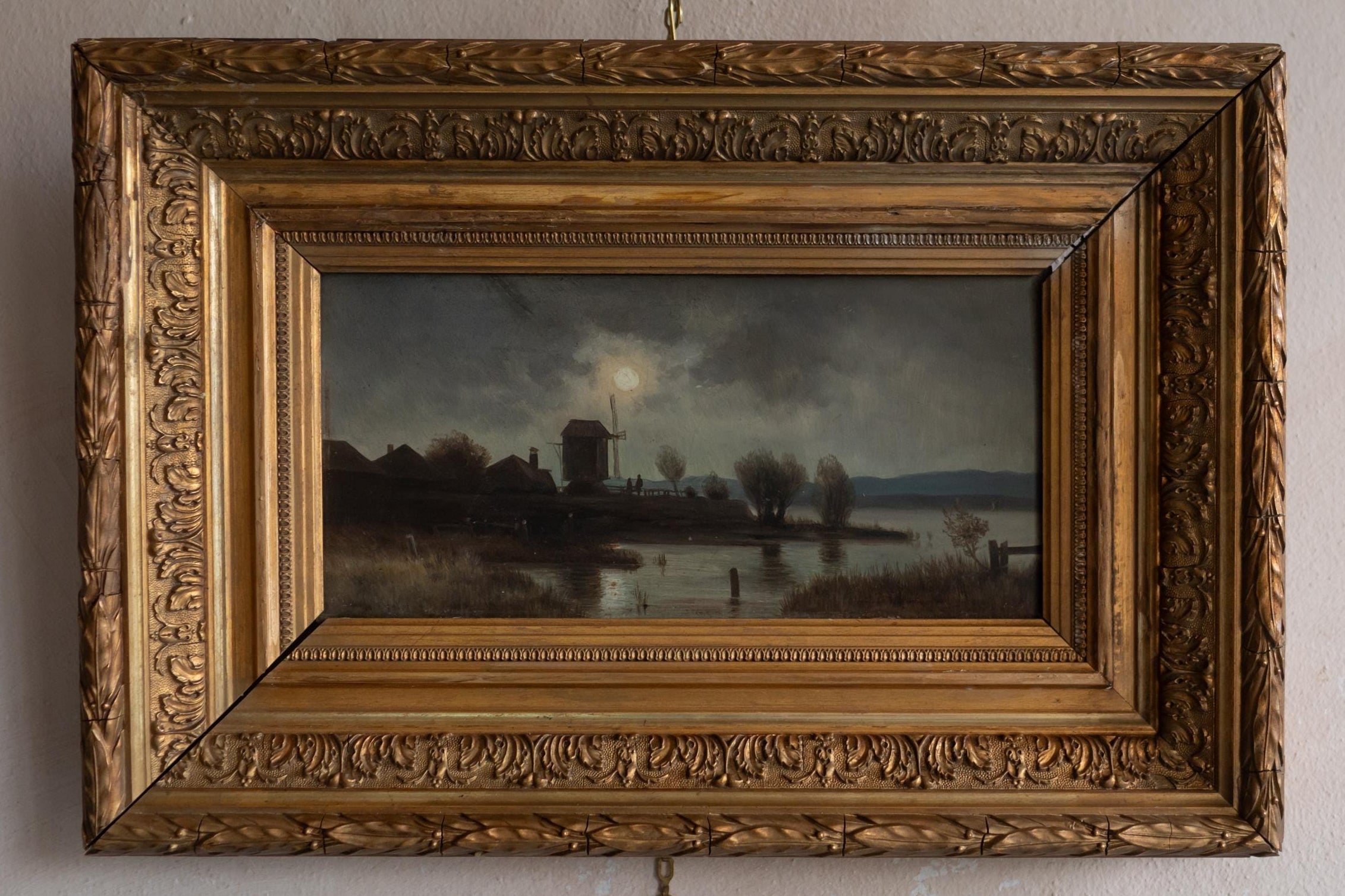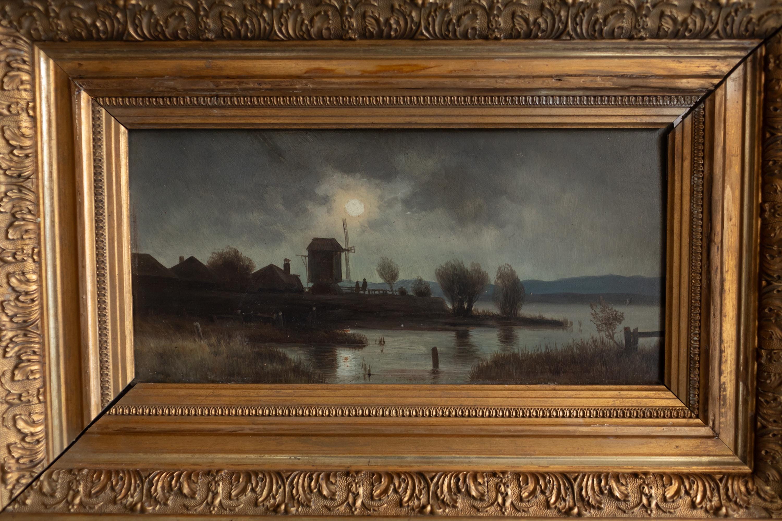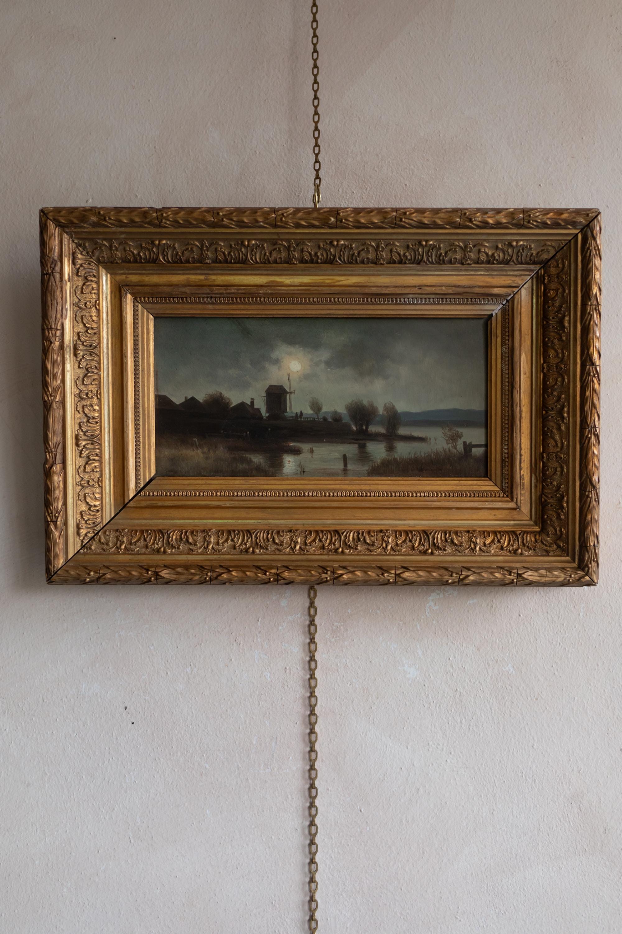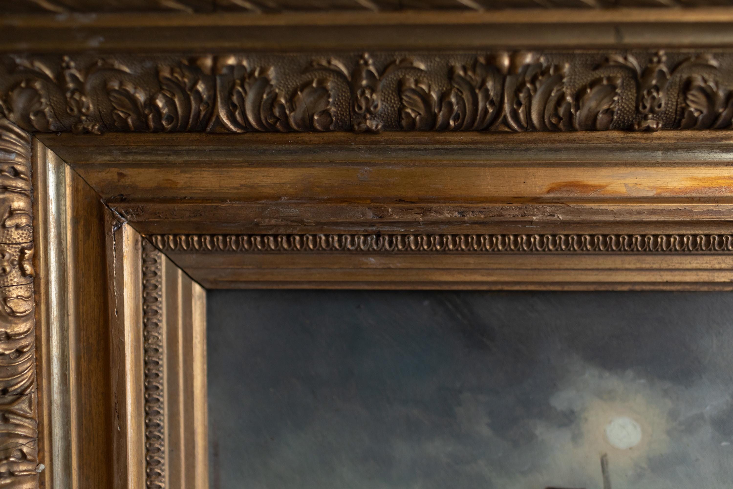 Good antique condition with light age-related wear. Paint surface is stable with gentle craquelure consistent with age. Frame retains its original gilding with patina and some wear on the frame after a few restorations. The painting is housed in a traditional feather (plume) gilt frame, characterised by its layered mouldings and leaf-like decorative edges. This type of frame was commonly used in the 19th century and is especially well suited to landscapes and nocturnes, enhancing depth and visual focus.