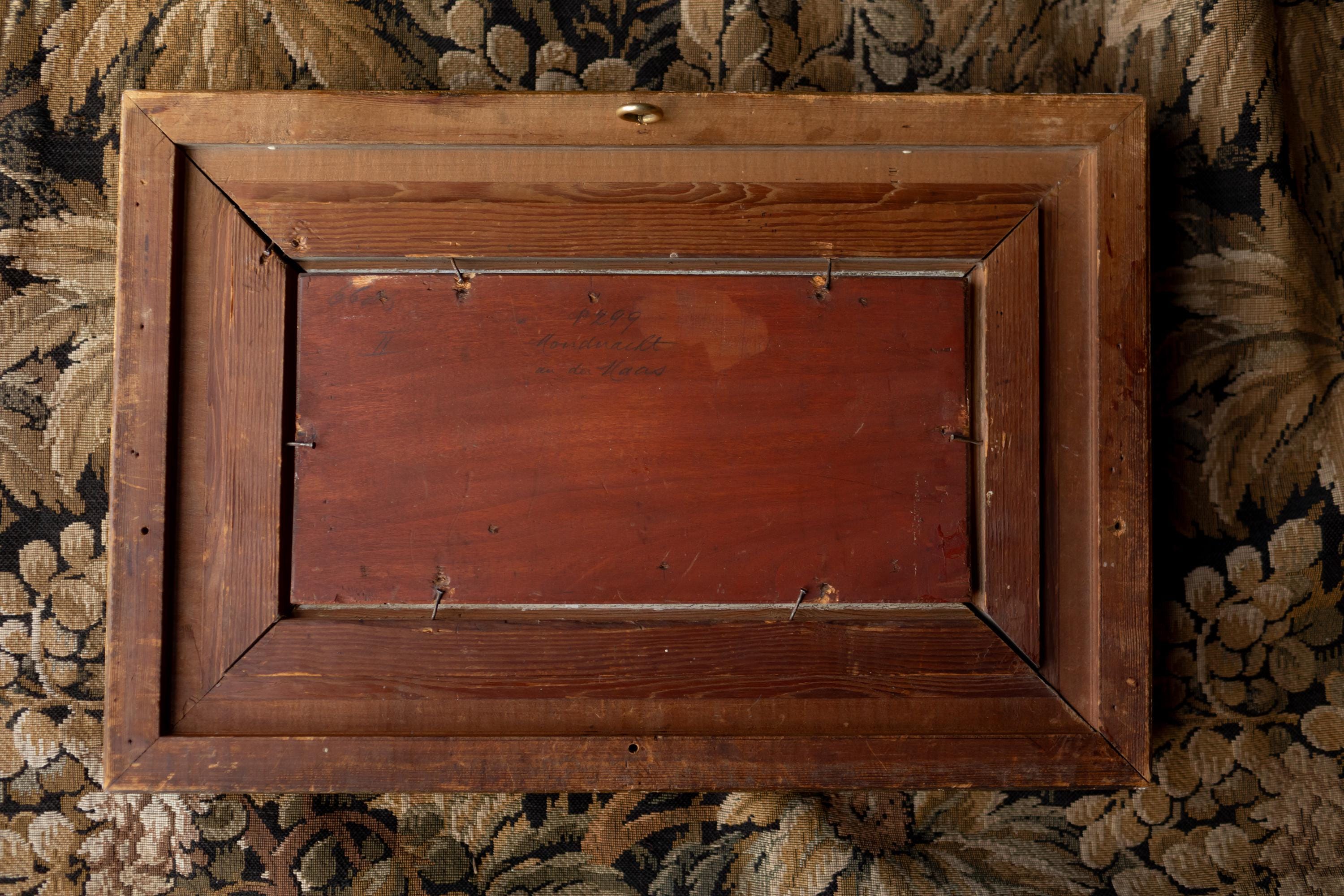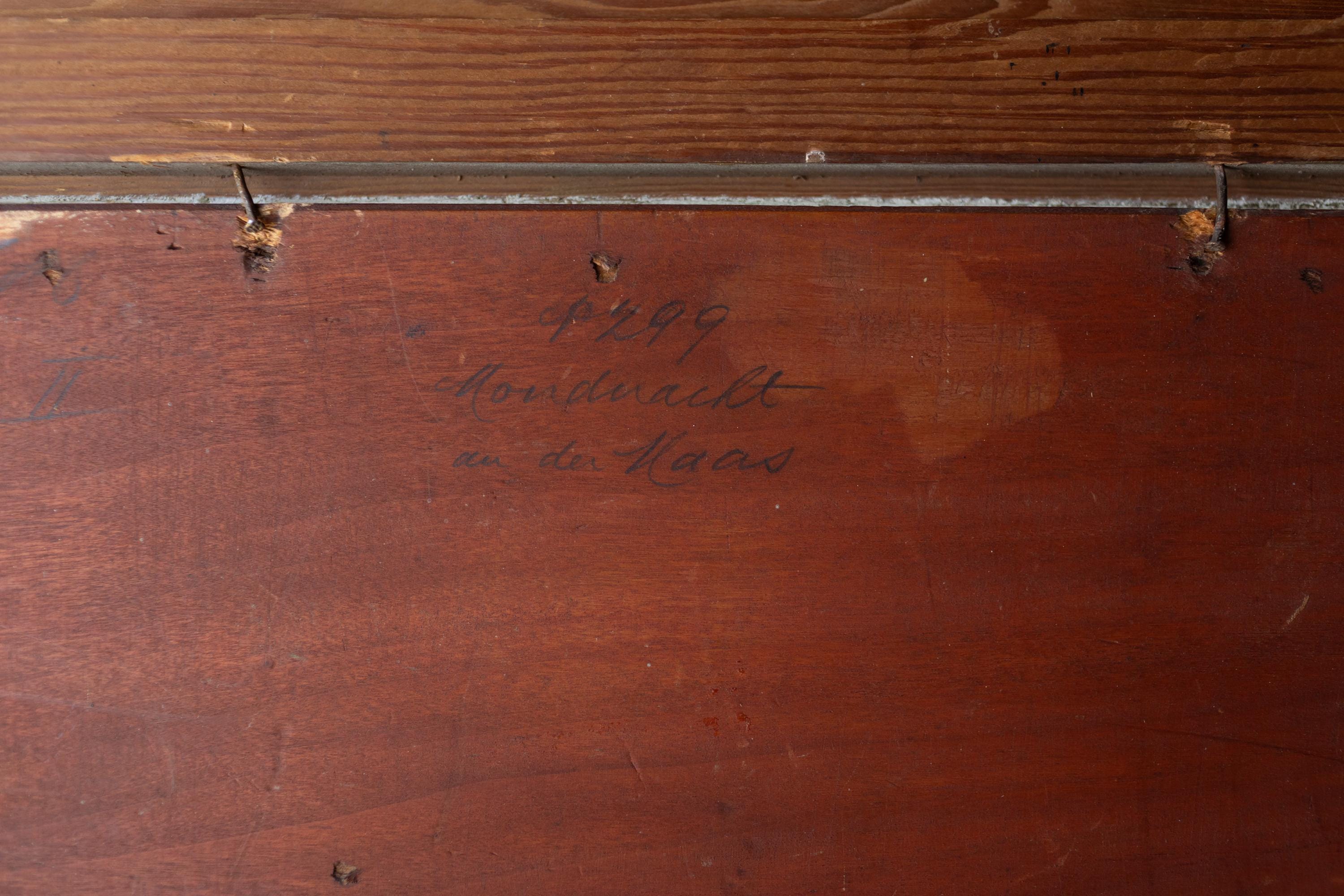 The title “Moonlight on the Maas”, written on the back of the painting in Dutch, suggests the scene represents the River Maas (Meuse), which flows through France, Belgium, and the Netherlands. Such moonlit river views were popular subjects in the 19th century, prized for their mood, reflection, and sense of quiet contemplation rather than topographical accuracy.