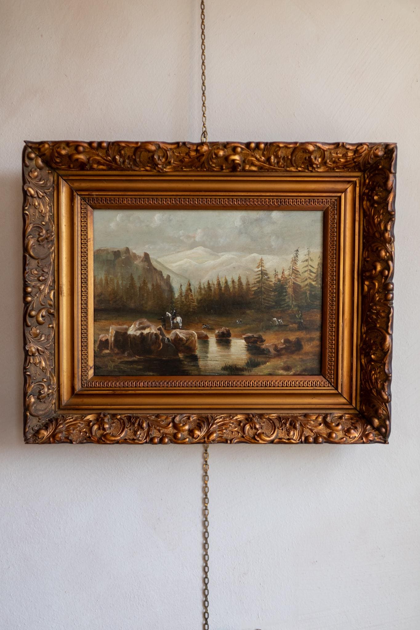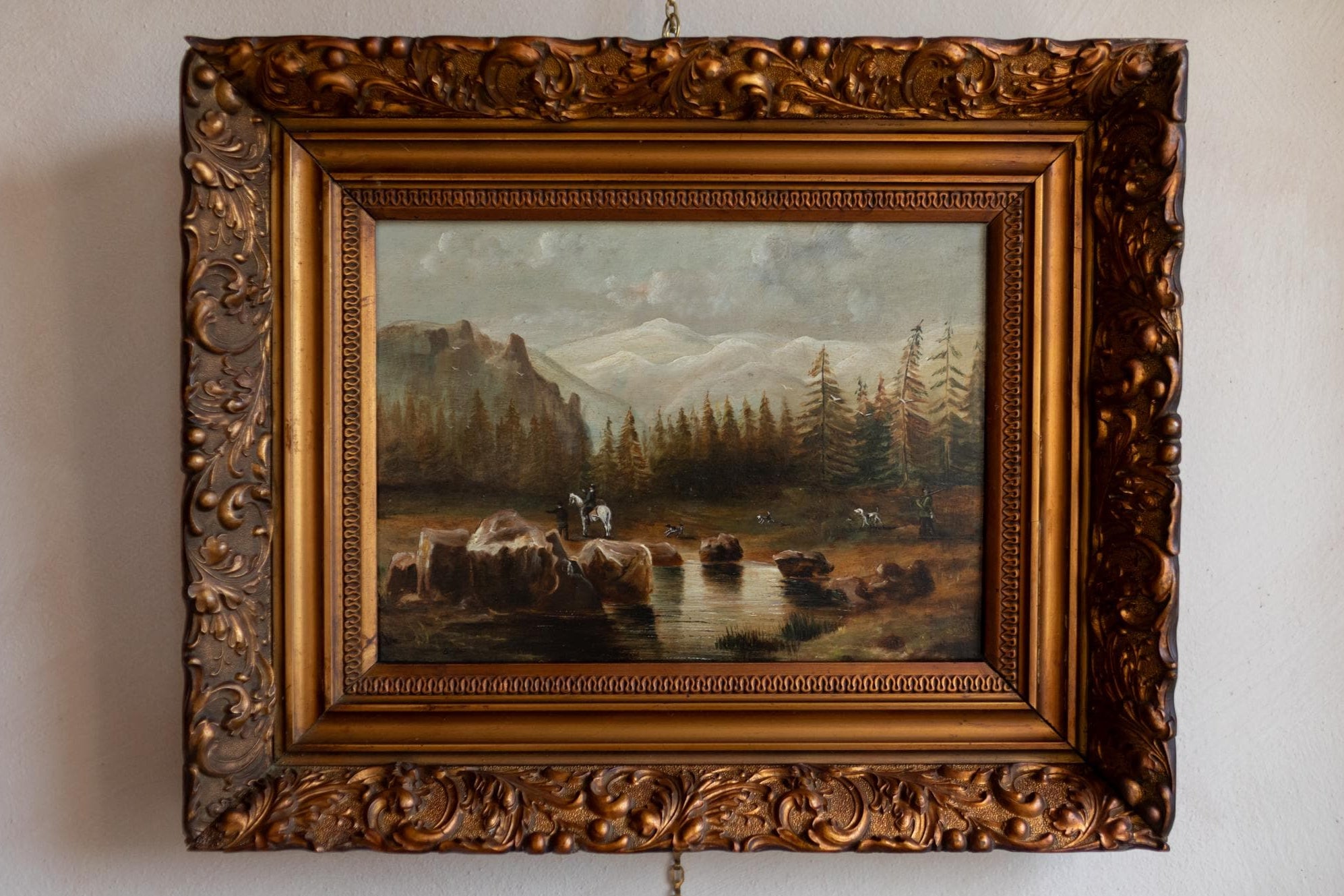Antique European Alpine Landscape Oil Painting – Hunters, Dogs & Mountains, Gold Framed