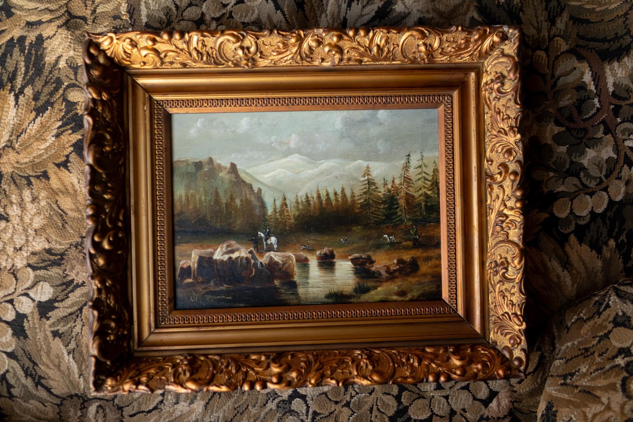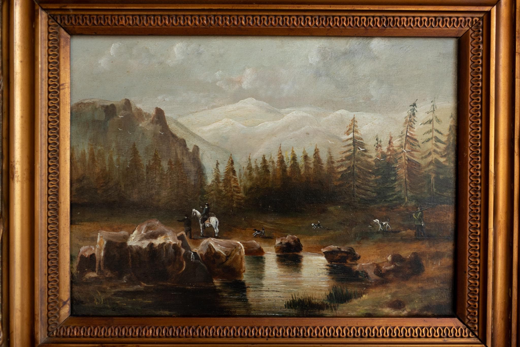 A beautiful 19th century French hunting scene, painted on wood panel, depicting riders and animals gathered in a tranquil mountain landscape. A finely detailed and atmospheric antique painting presented in its richly ornate gilt frame. At the centre of the composition, a mounted rider pauses beside a calm stream, surrounded by grazing animals and scattered rocks. Behind them, a dense forest of tall pines rises toward distant mountains, their pale peaks softly visible through the atmosphere.