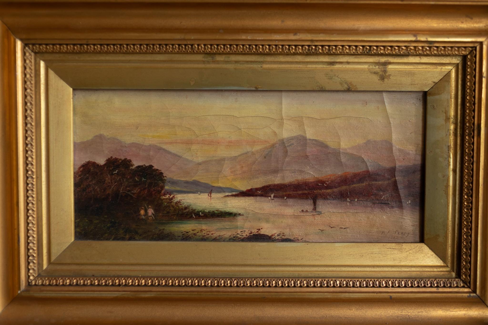 A tranquil early 20th century European lake landscape painted in soft evening tones, dated 1912. This original oil on canvas depicts a calm stretch of water surrounded by distant mountains and autumn trees. A serene and timeless composition filled with quiet atmosphere. Signed in the lower right, H.M. Ferry.