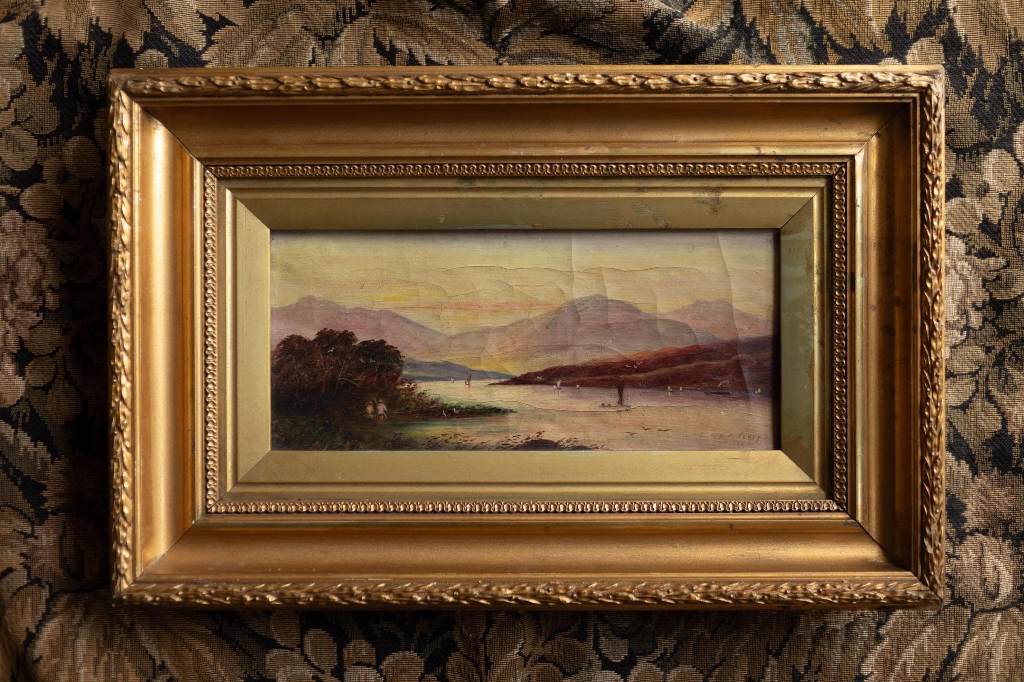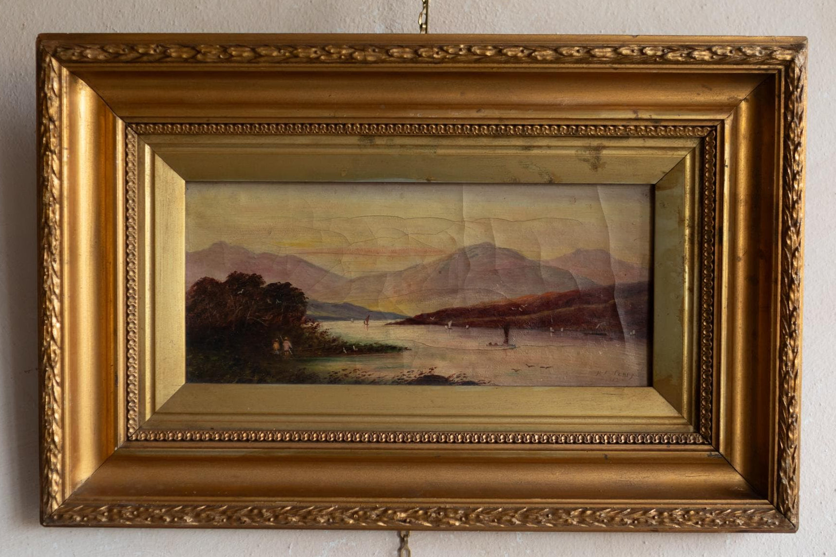 This beautifully composed antique landscape captures a still mountain lake at sunset. Gentle hues of mauve, gold, and green wash across the scene as boats glide over the reflective water. The painter’s delicate brushwork and sense of depth evoke the spirit of Romantic landscape painting popular at the turn of the century. The golden gilt frame, rich in detail and patina, perfectly complements the peaceful subject. A poetic and meditative painting that brings a sense of calm to any room.