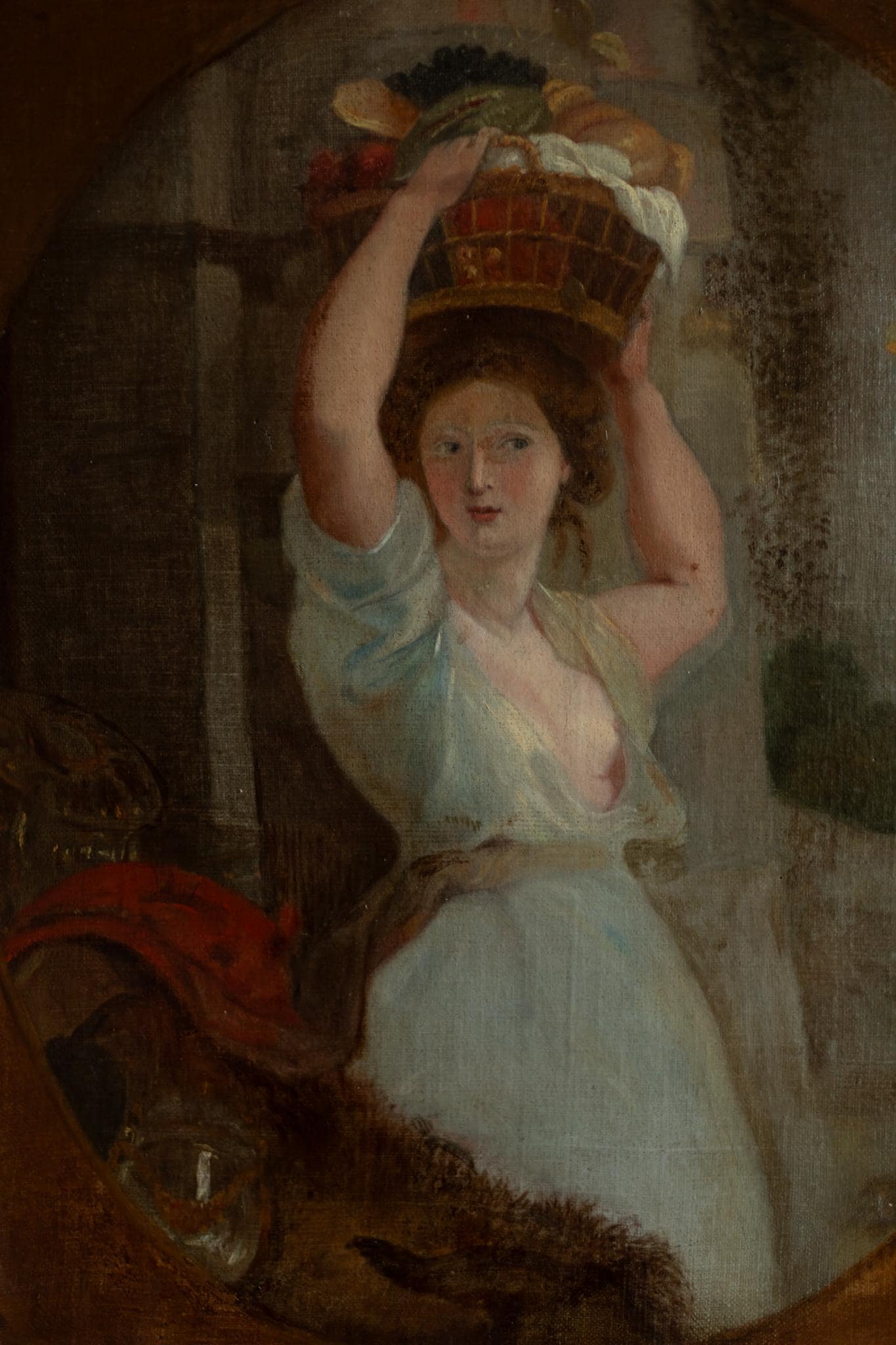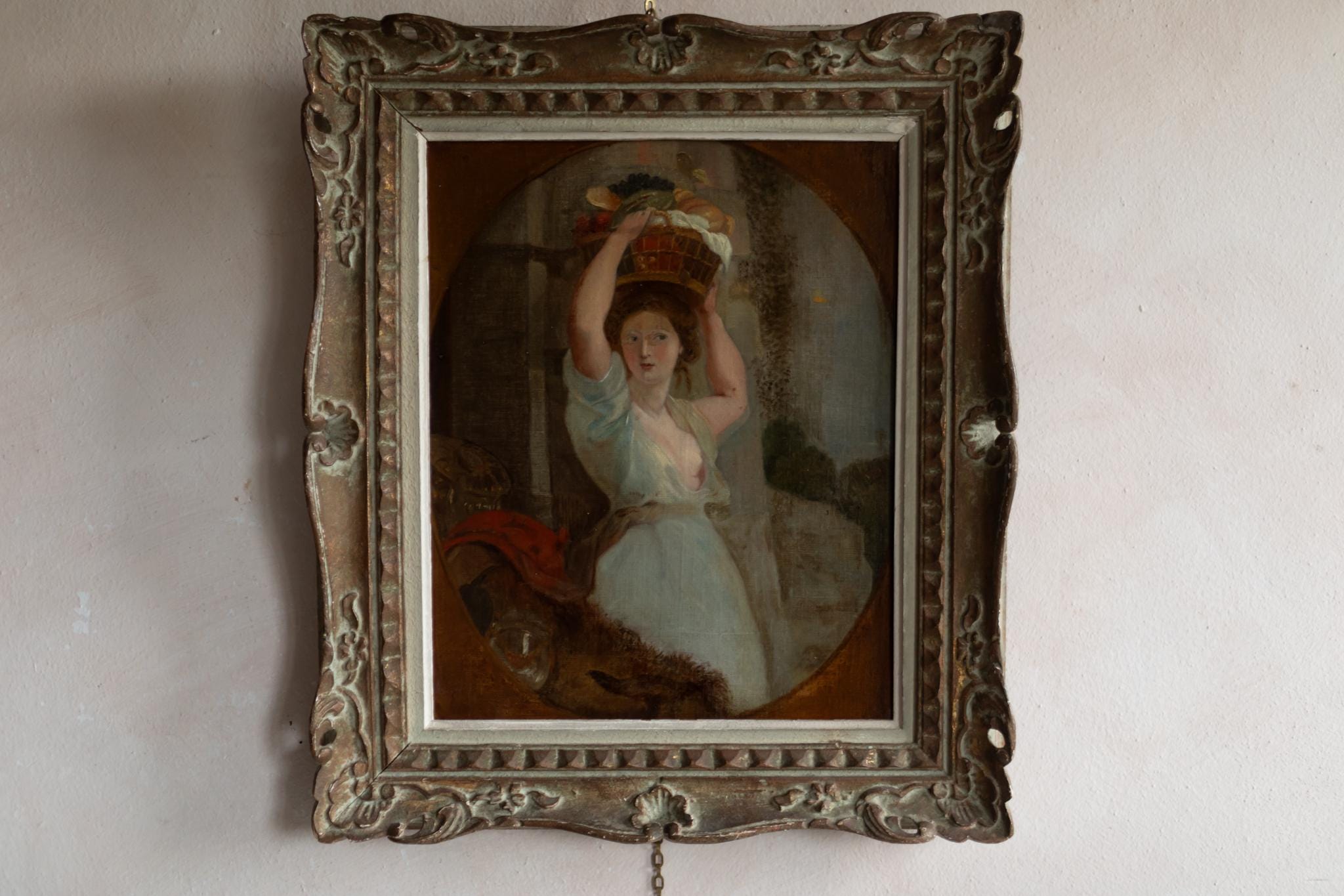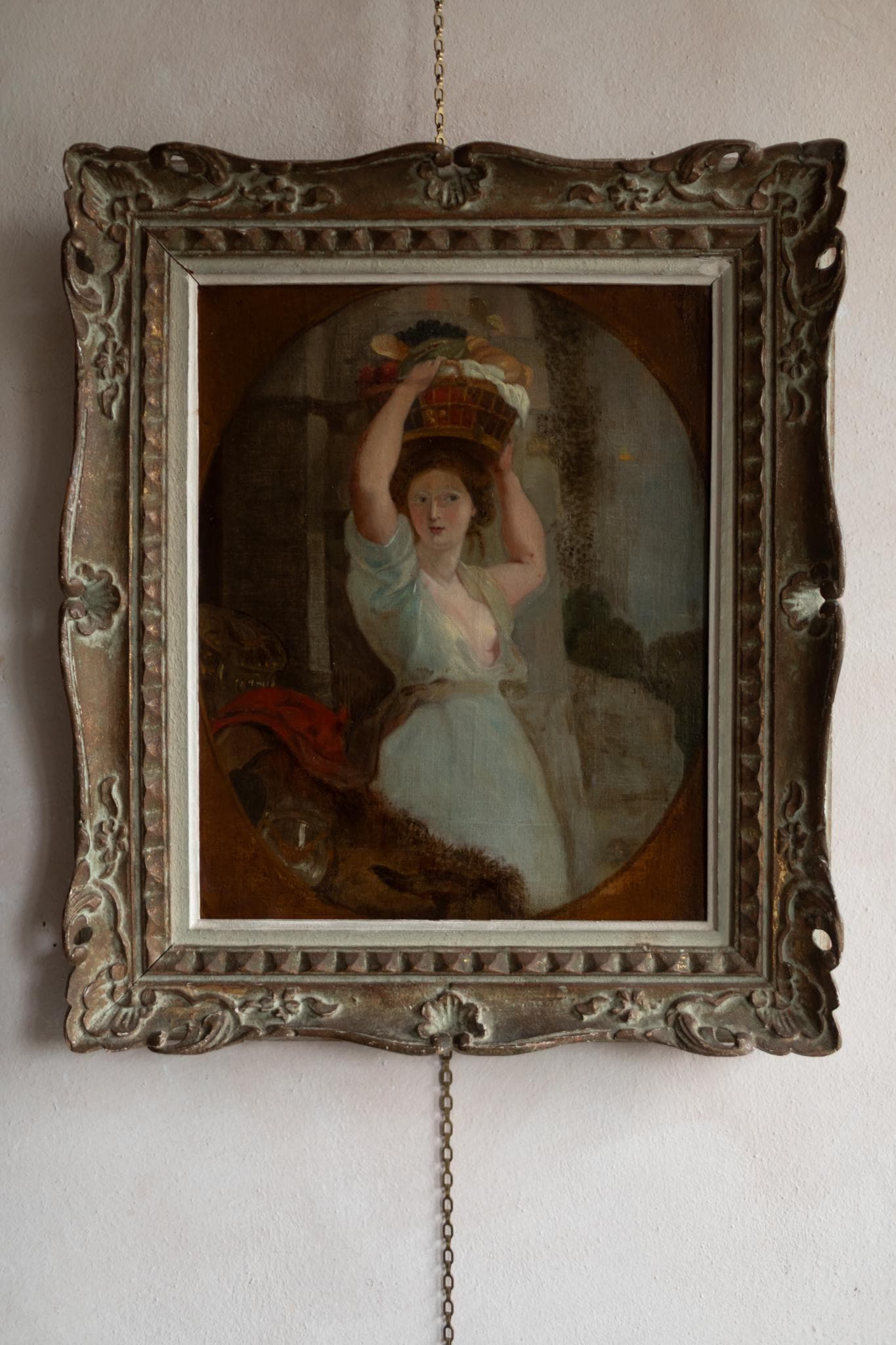This evocative portrait depicts a young French woman in a light dress, balancing a basket of fruit and produce on her head. Painted with warm, earthy tones and framed within a decorative border, the subject reflects the romanticised imagery of rural life popular in the 19th century. Her direct gaze and confident stance add character to the work, blending realism with a touch of allegory. The canvas has a wonderful patina that enhances its antique charm, while the elaborate frame completes its presence as a decorative statement piece.
