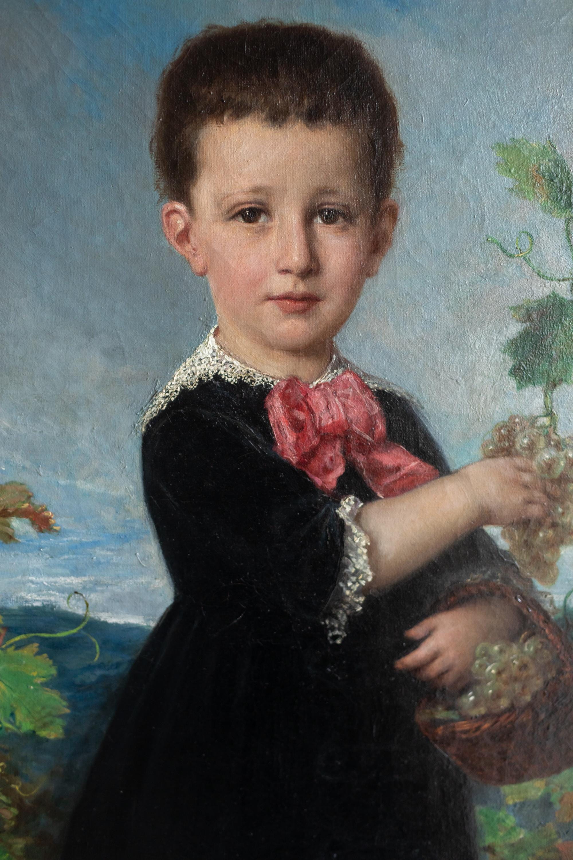 A beautifully painted mid-19th century French child portrait from the Bordeaux region of France and dating to around 1860. Rich in charm and symbolism, this oil painting captures youthful innocence in a vineyard setting. The young child is depicted holding a basket of grapes, set against a softly rendered vineyard landscape, an elegant nod to the area’s long-standing wine heritage. The grapes, gently gathered in the child’s hands and basket, suggest abundance and regional identity, reinforcing the connection to Bordeaux’s viticultural tradition. Mid-19th century child portraits such as this were often commissioned by prosperous families to commemorate lineage and prosperity. This was likely the child of a Bordeaux Vigneron and painted as a family portrait for the estate.