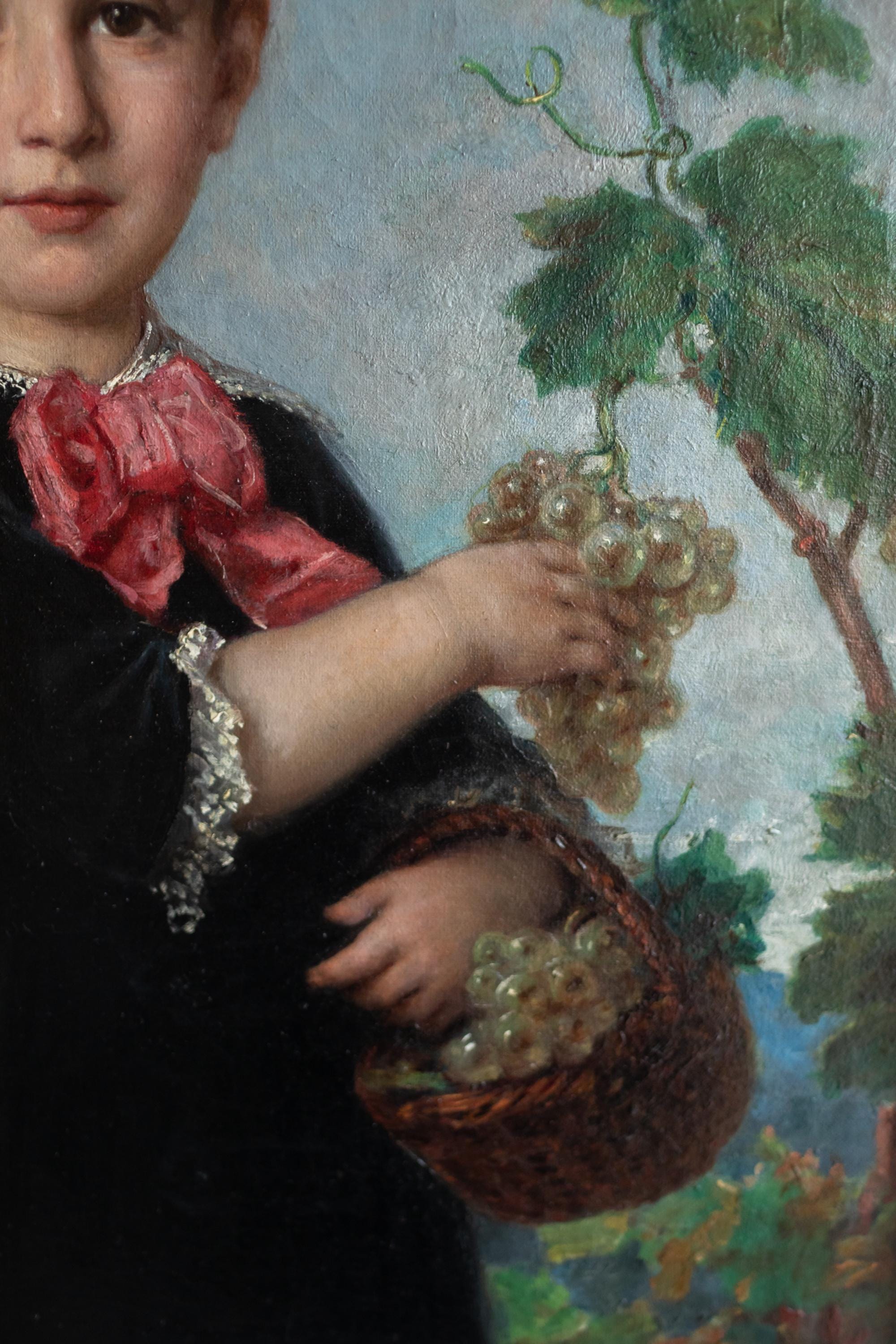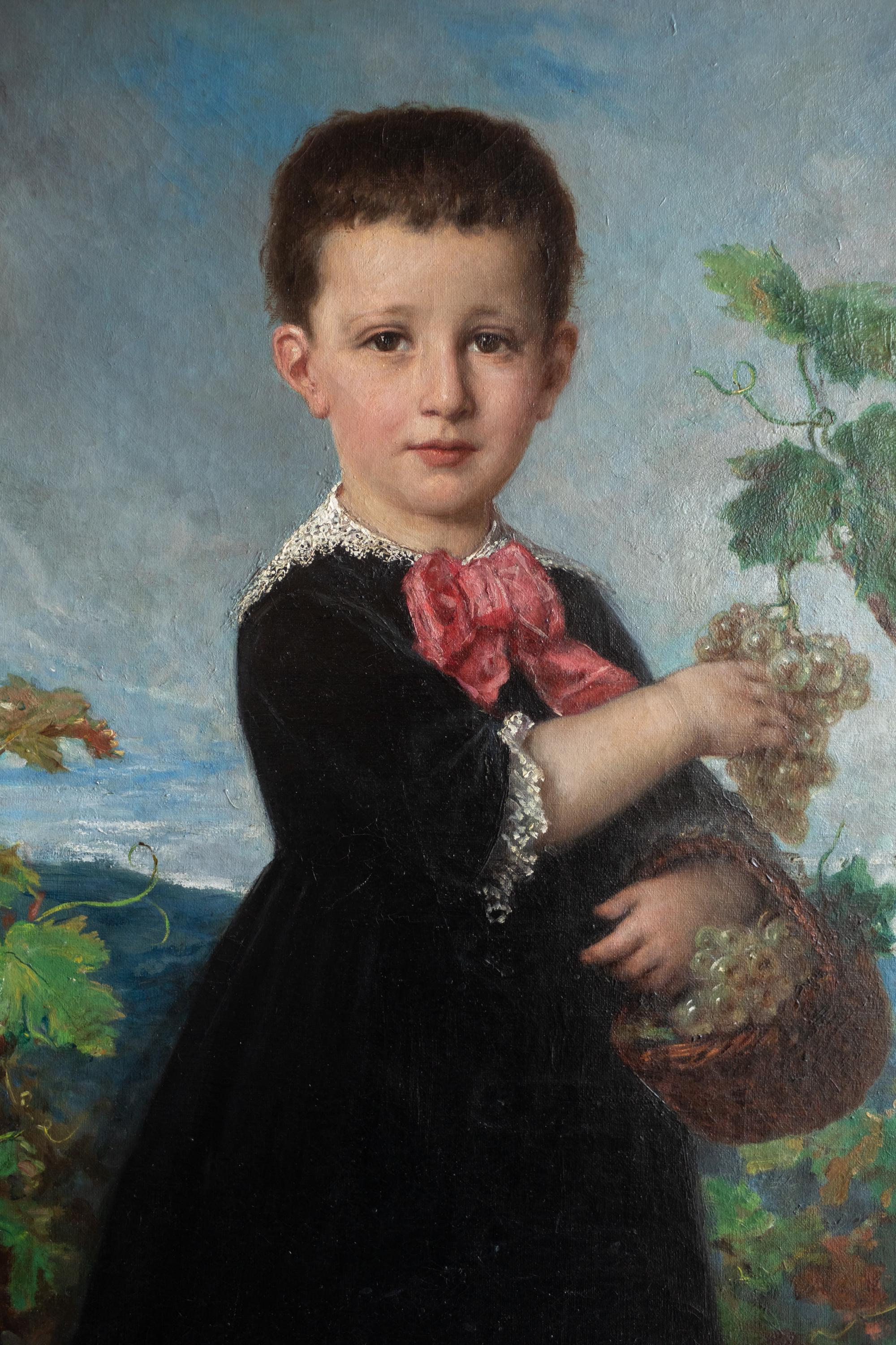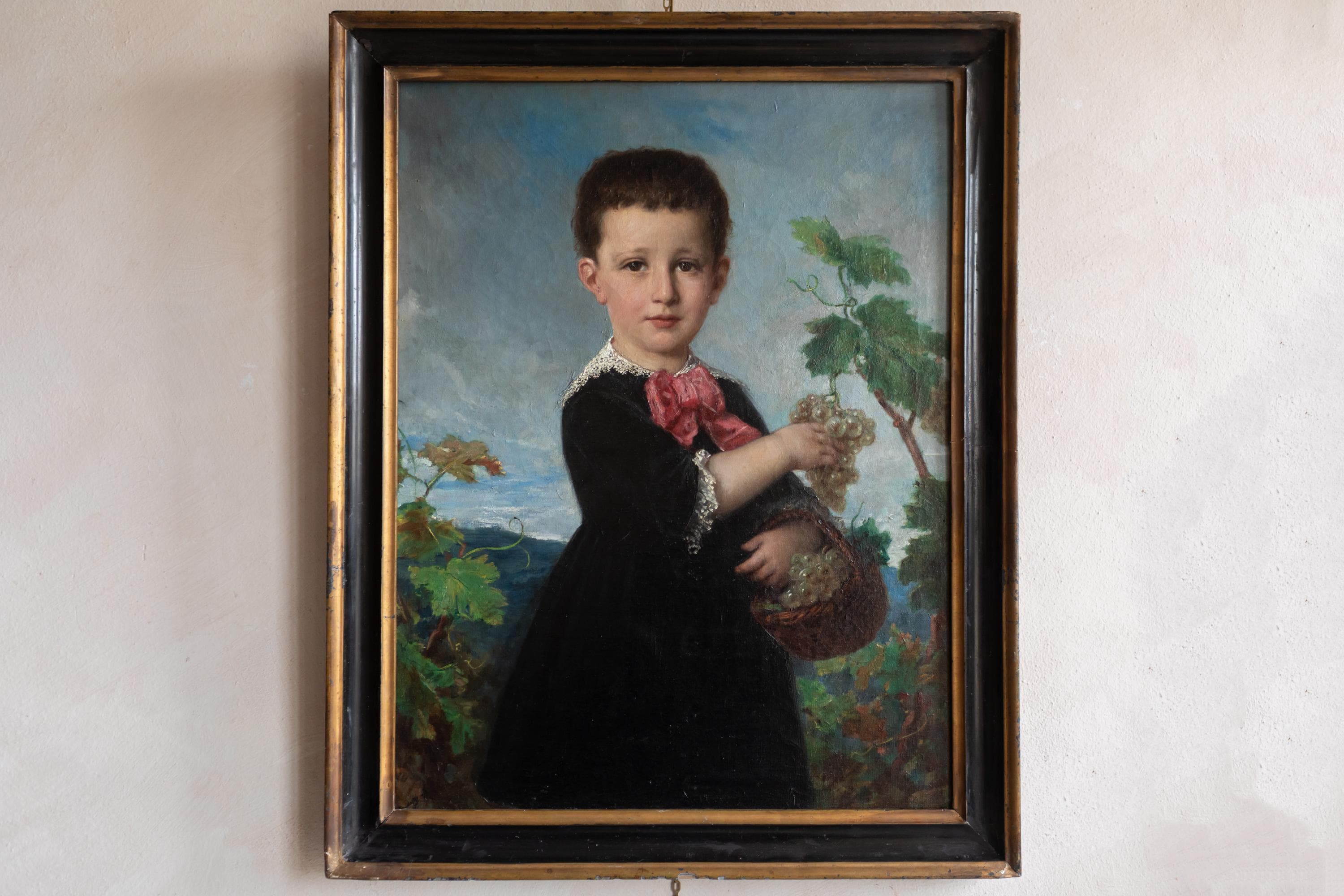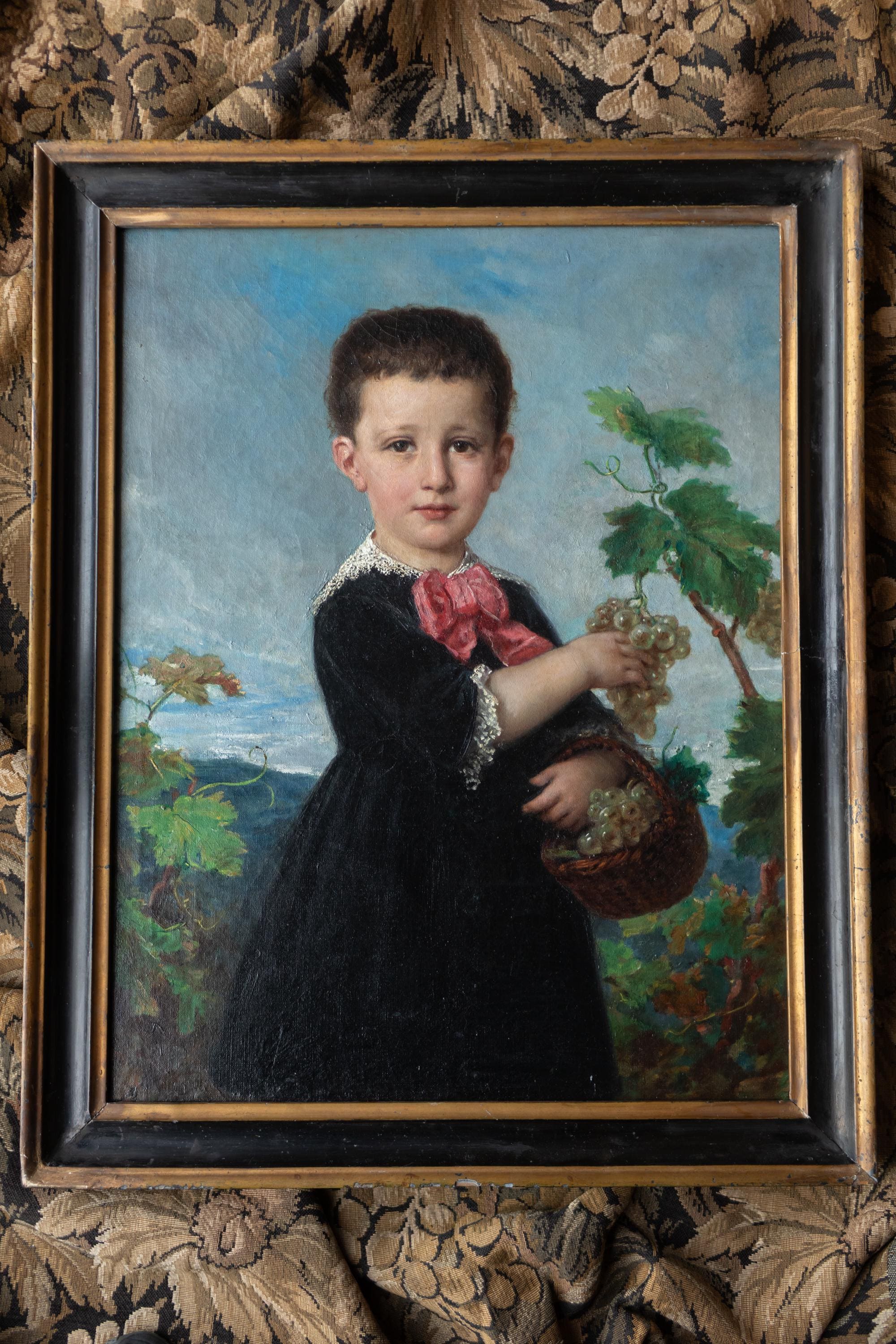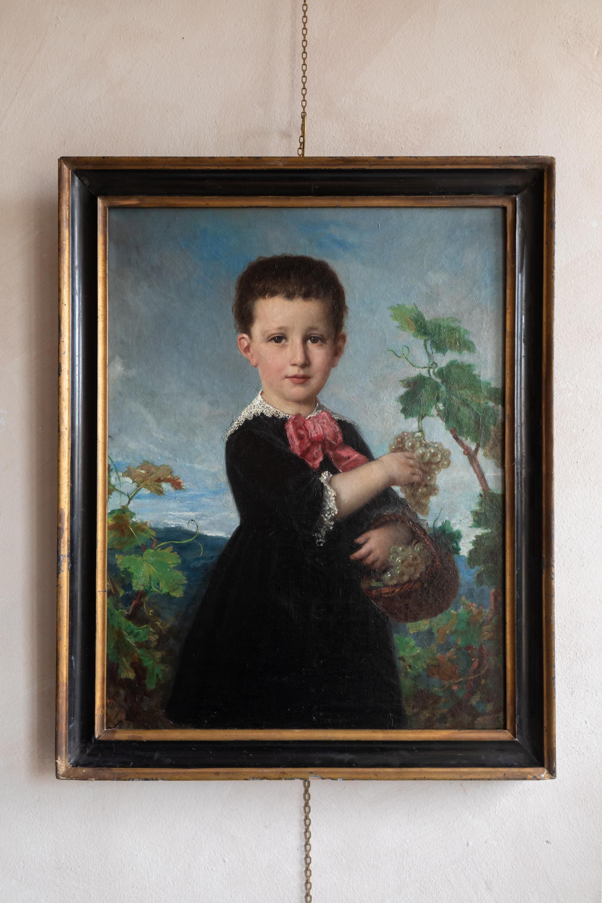 Antique French Child Portrait with Grapes – 19th Century Oil Painting in Black Gold Frame
