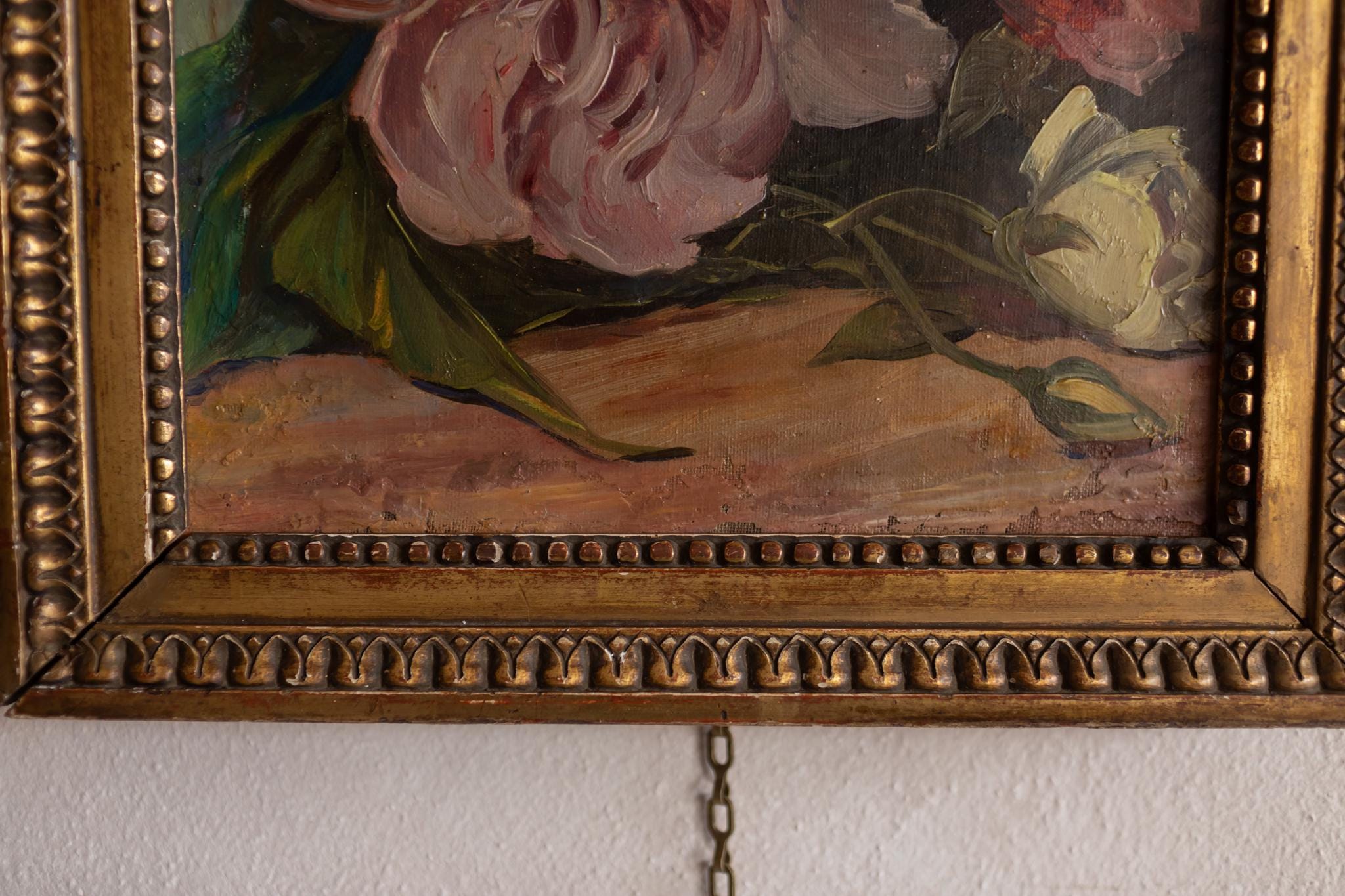 Antique French Floral Oil Painting – Pink Peonies Still Life in Gold Frame