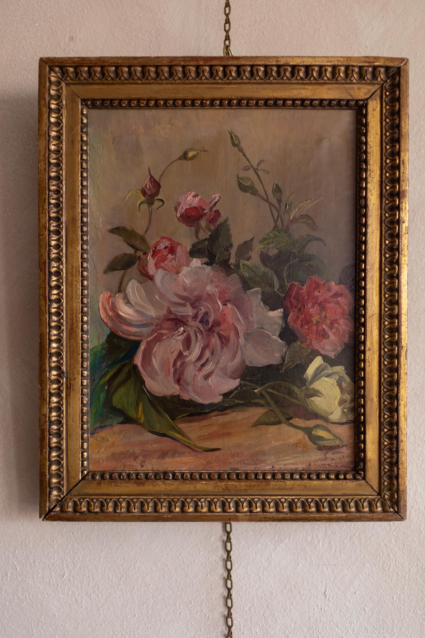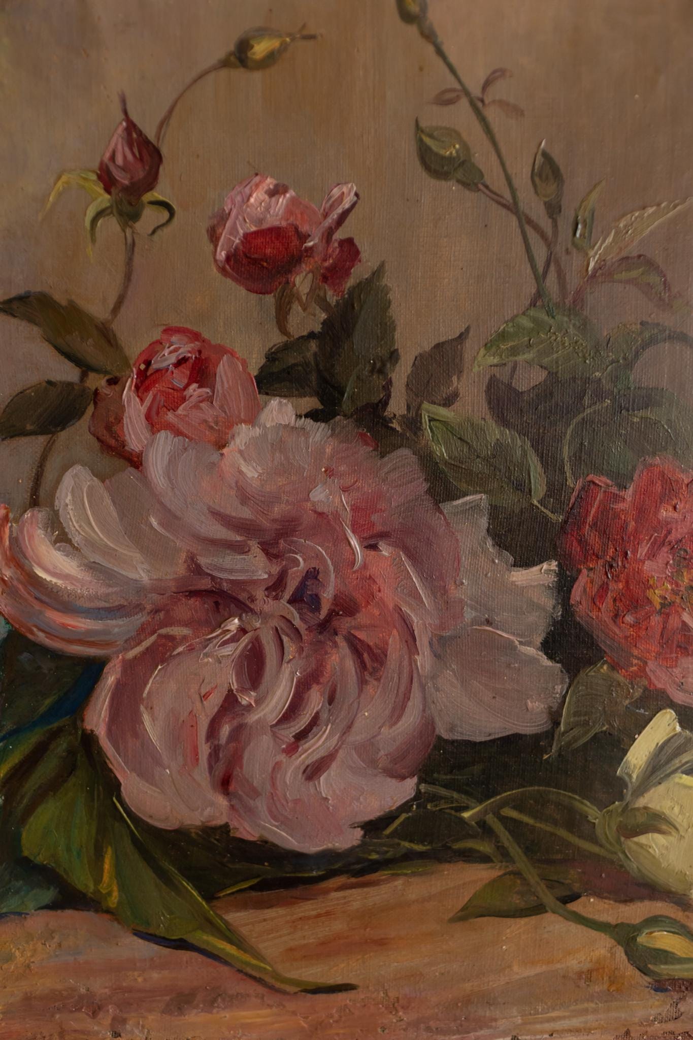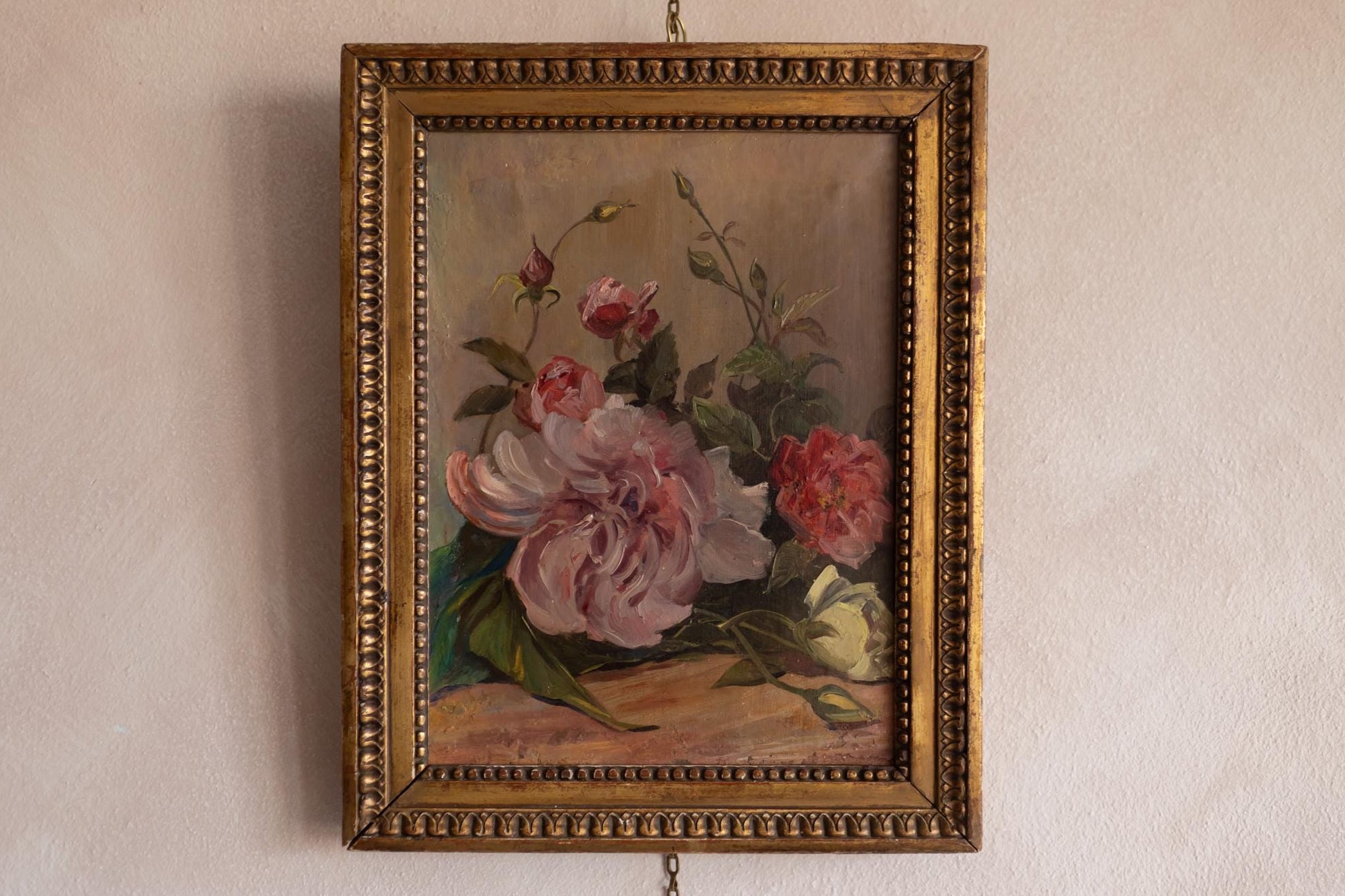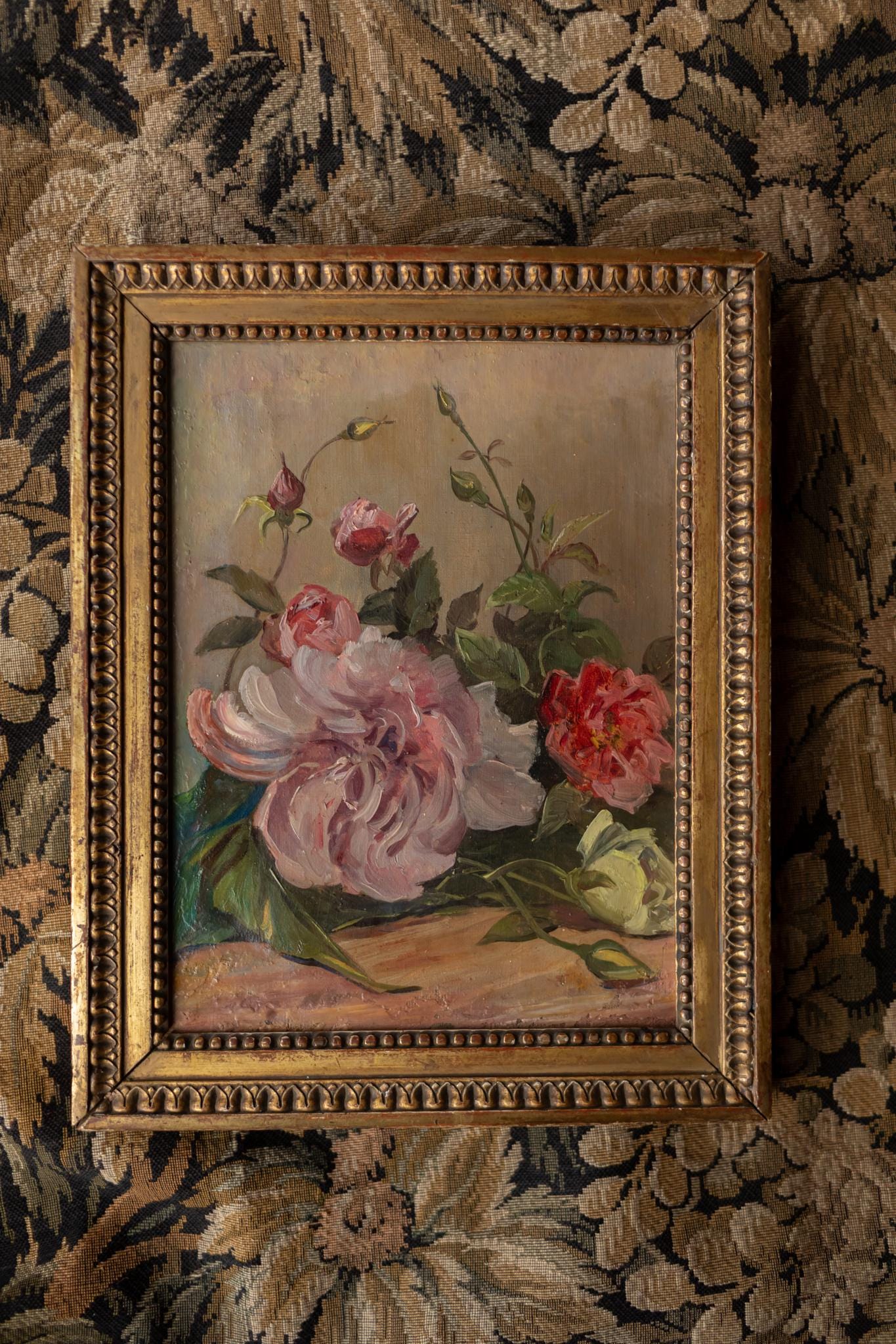 A beautifully painted French floral still life from the early 20th century, featuring a loose arrangement of peonies and buds. A soft, romantic composition presented in its classic gilt frame. The composition feels spontaneous and alive. The flowers are not rigidly arranged but instead seem gently gathered, with petals opening and curling in soft shades of pink, cream, and red. The artist has used expressive brushwork to suggest movement and softness, giving the blooms a lush, almost tactile quality. The palette is warm and harmonious, with muted background tones allowing the flowers to take centre stage. Light falls softly across the petals, highlighting their volume and delicacy.