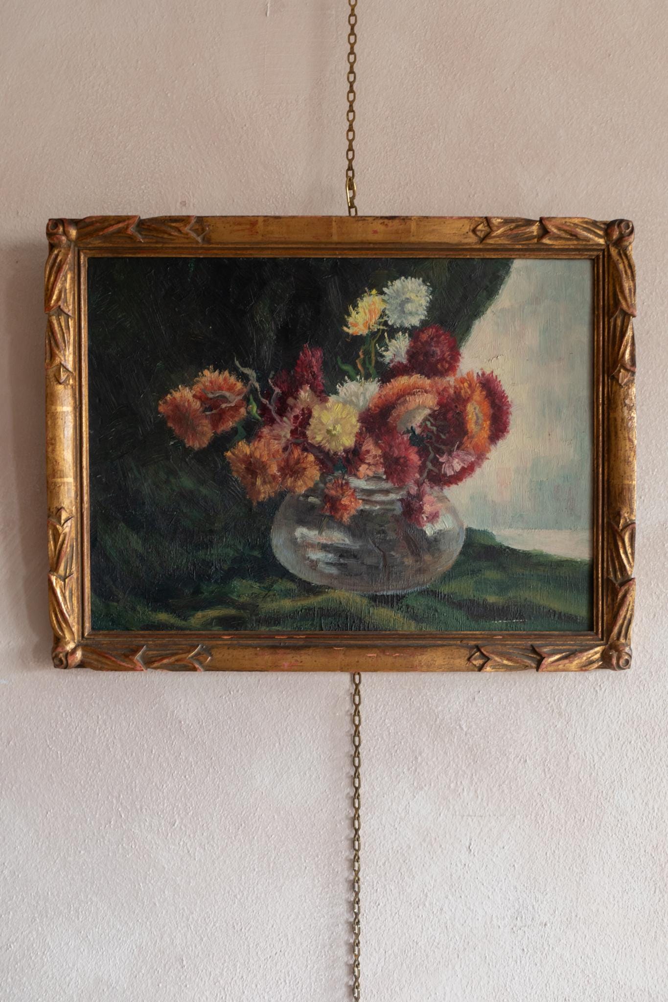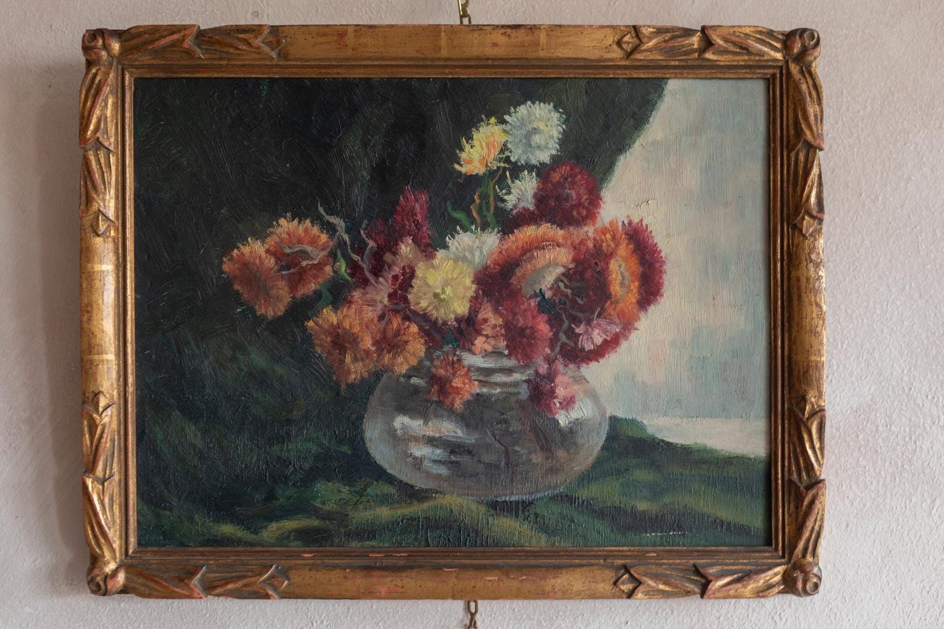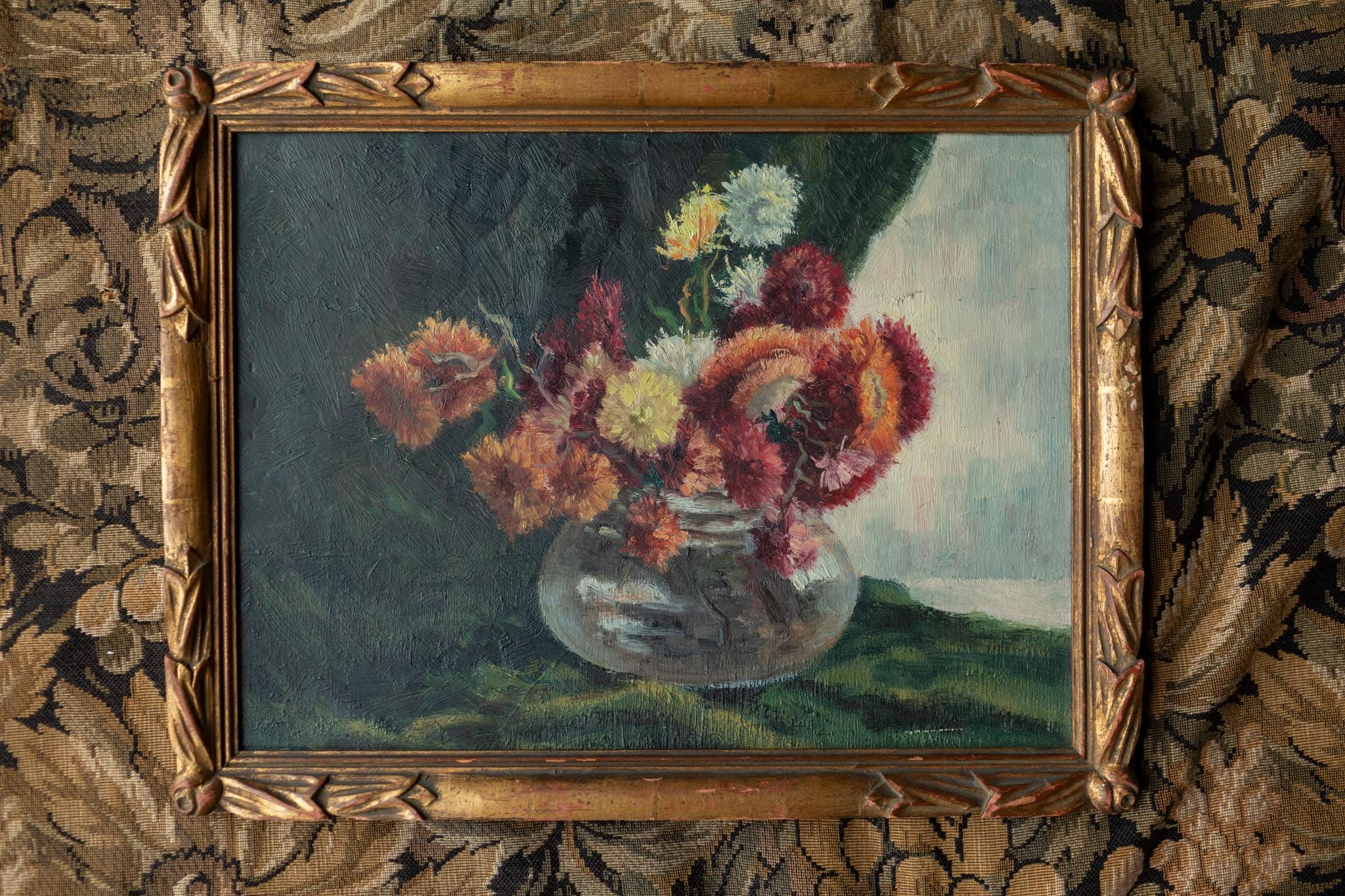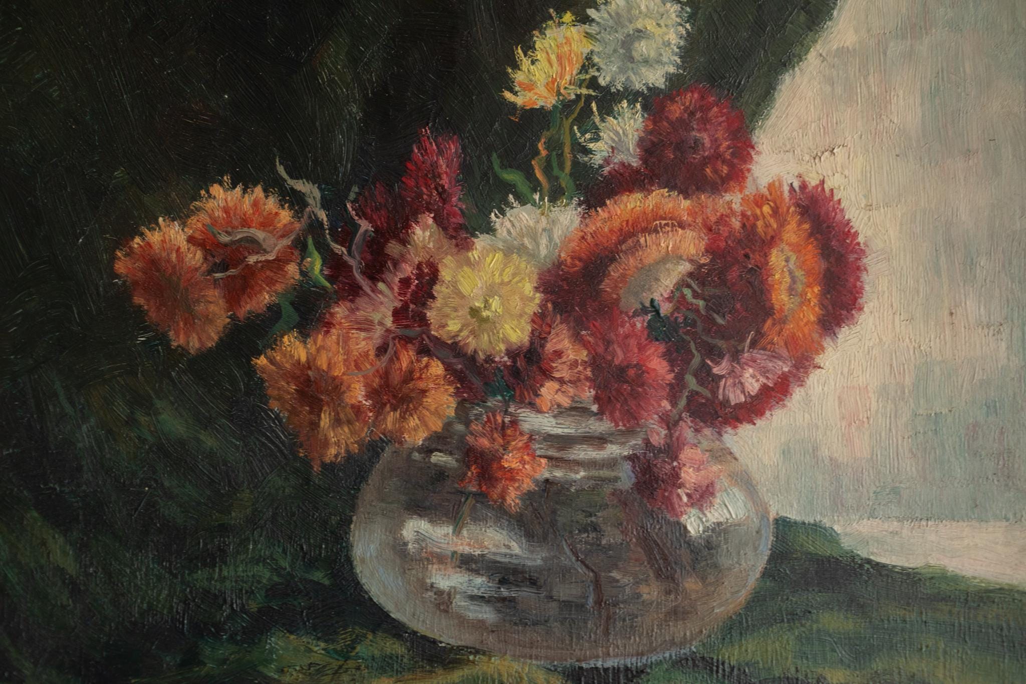 A beautiful French floral still life dating from around 1920, painted in a loose Impressionist style. This elegant French floral still life captures a vibrant bouquet of garden flowers arranged in a rounded glass vase. The artist focuses on colour and atmosphere rather than strict realism. Rich reds, soft creams, and warm orange tones contrast beautifully against the deep background, allowing the flowers to emerge with lively energy. The expressive brushwork and layered paint give the bouquet a sense of movement and freshness.
