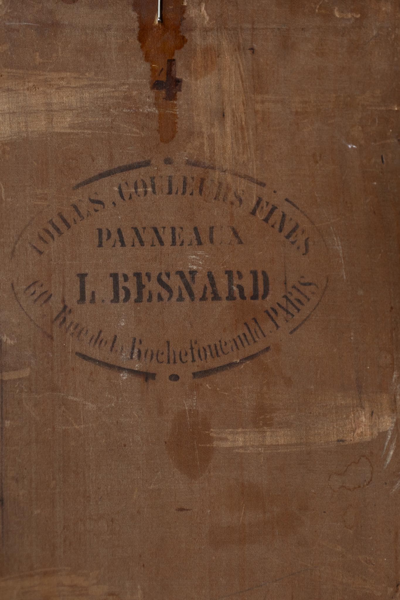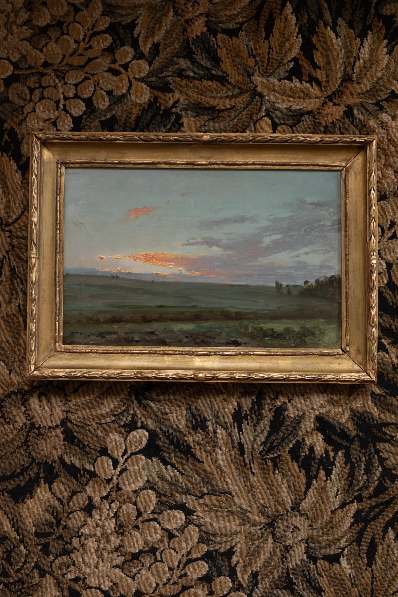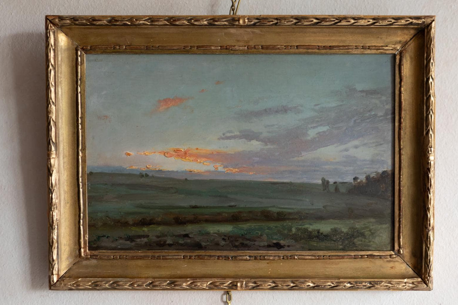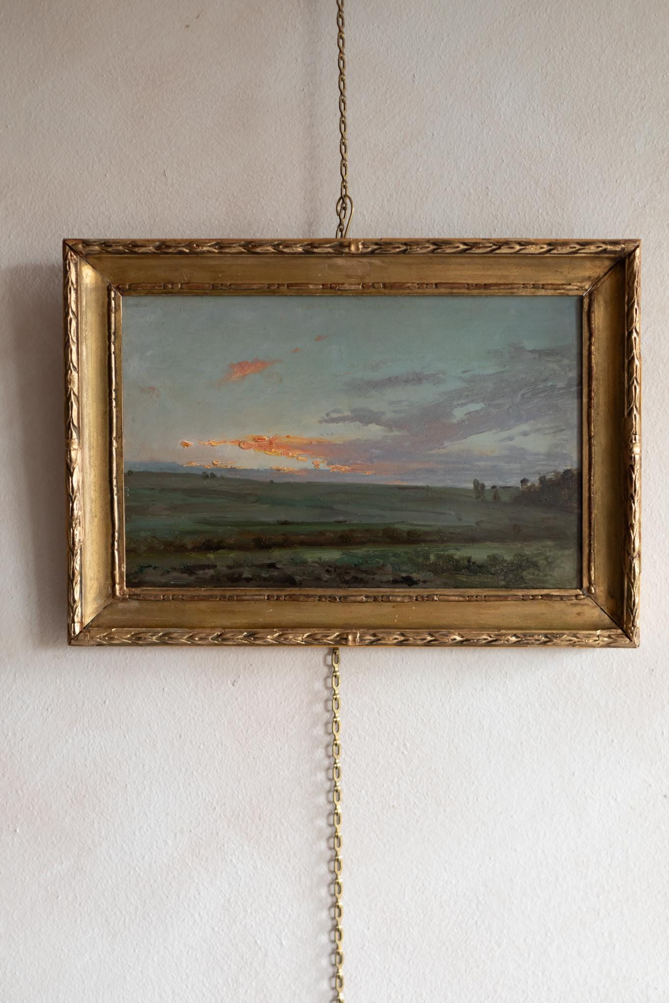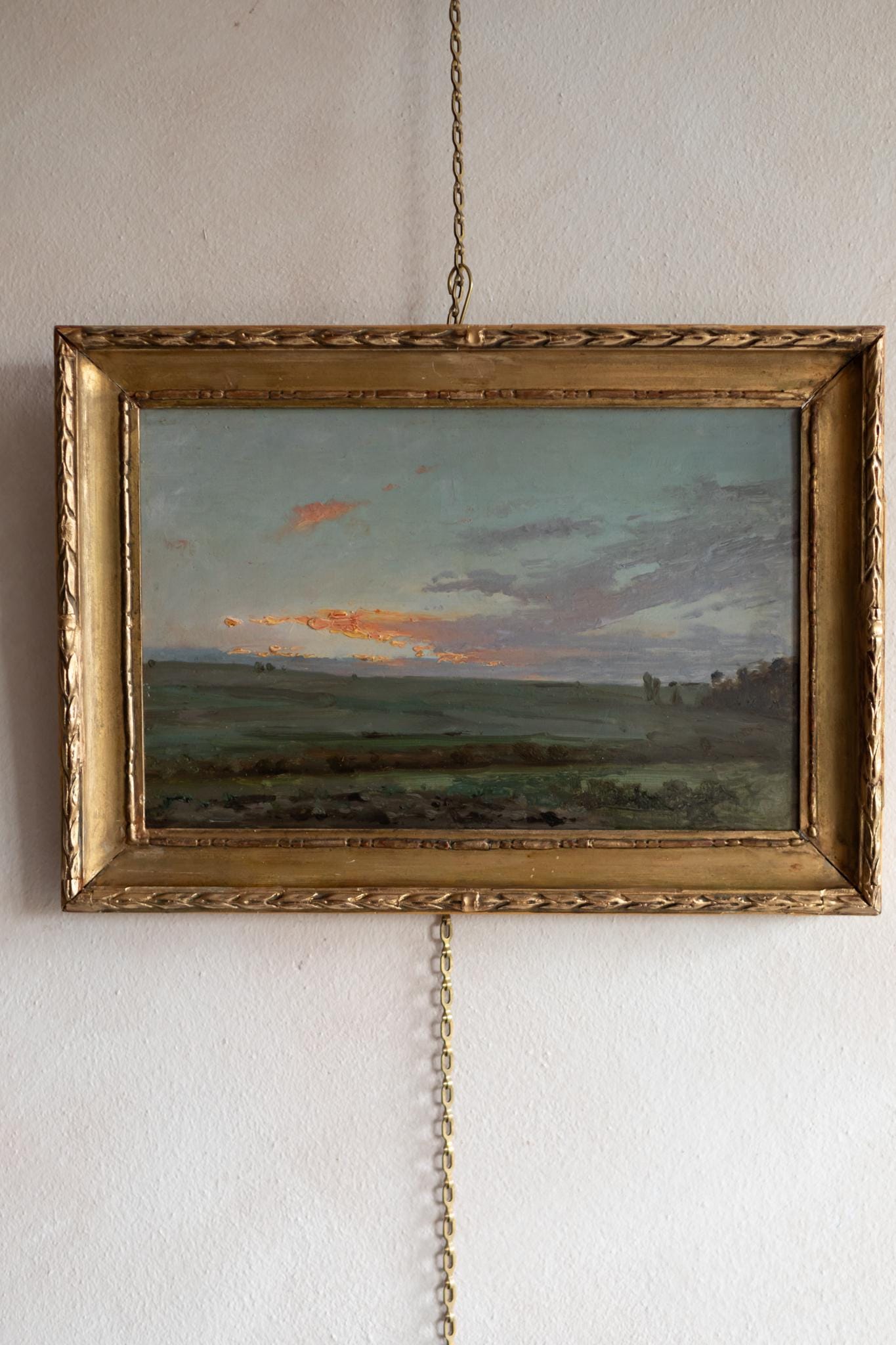 This wonderful French antique landscape oil painting dates from the late 19th century. A very charming serene scene, amazing colours, talented hand of the artist delivering a beautiful sunrise with a nice thick impasto. This antique oil painting comes in an antique gold frame. It is marked on the back from "Paris" and it's art materials supplier.
