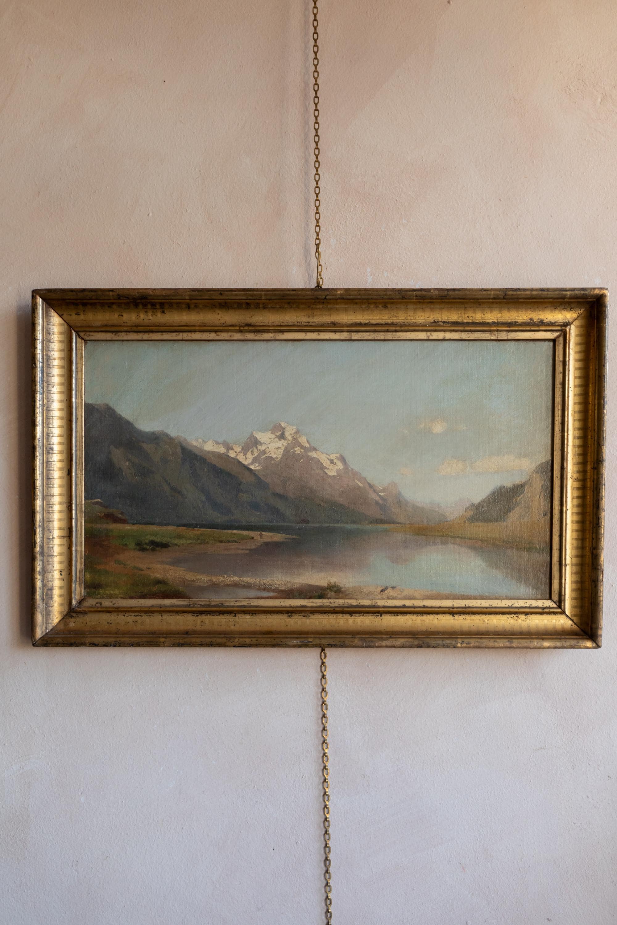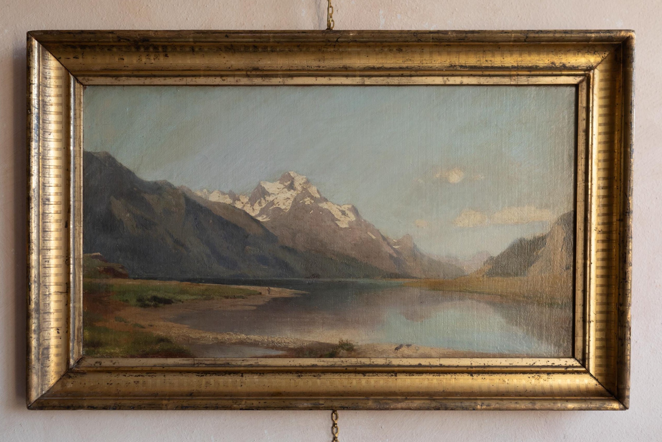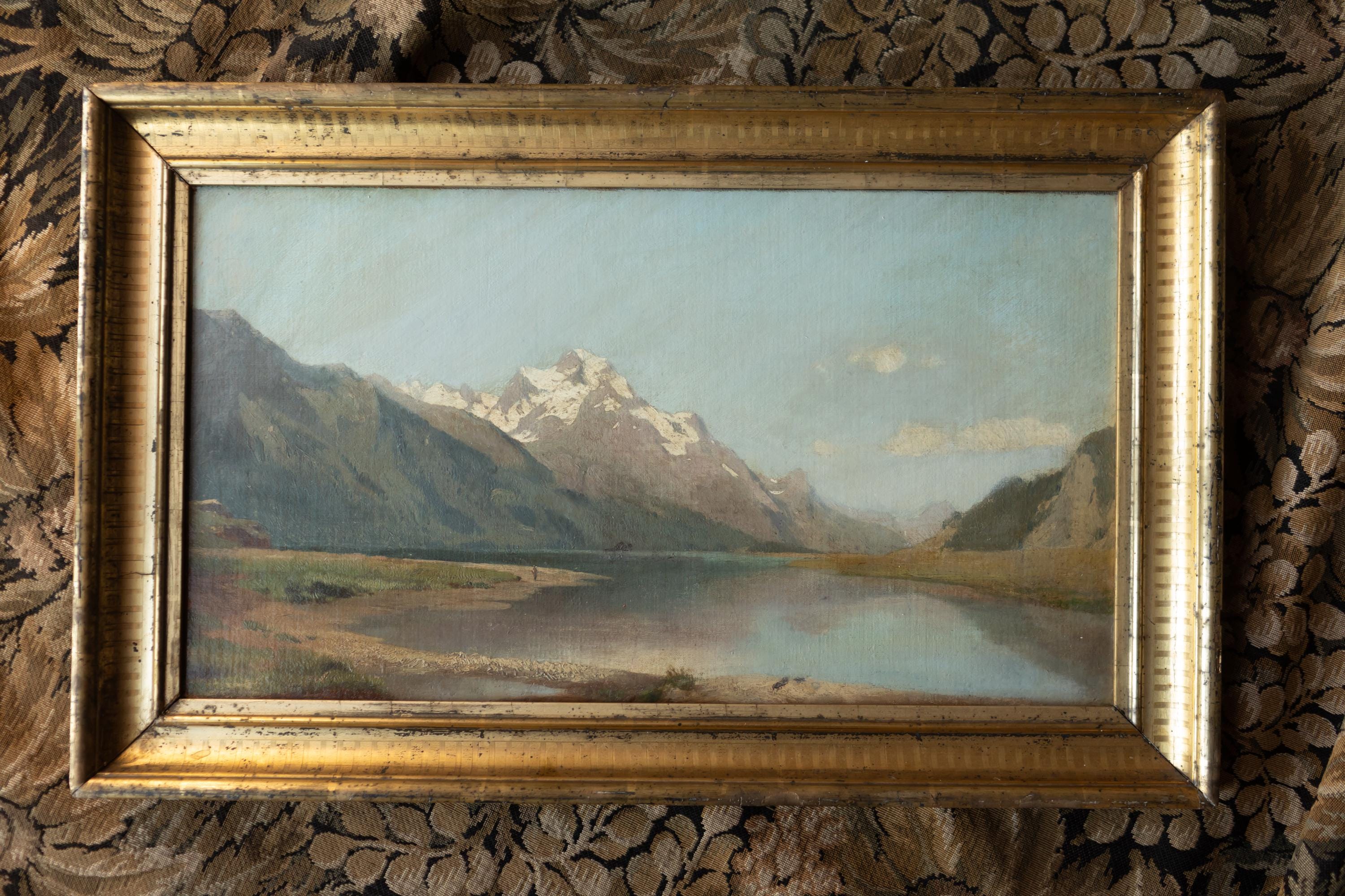 A beautifully composed late-19th-century idealised landscape of the Swiss Alps, featuring snow-capped peaks reflected in a tranquil mountain lake. A luminous and atmospheric antique oil painting presented in its period gilt frame. The handling of light across the distant peaks and the subtle gradation of tones in the valley demonstrate confident academic technique. The calm water surface enhances the painting’s peaceful and contemplative mood.