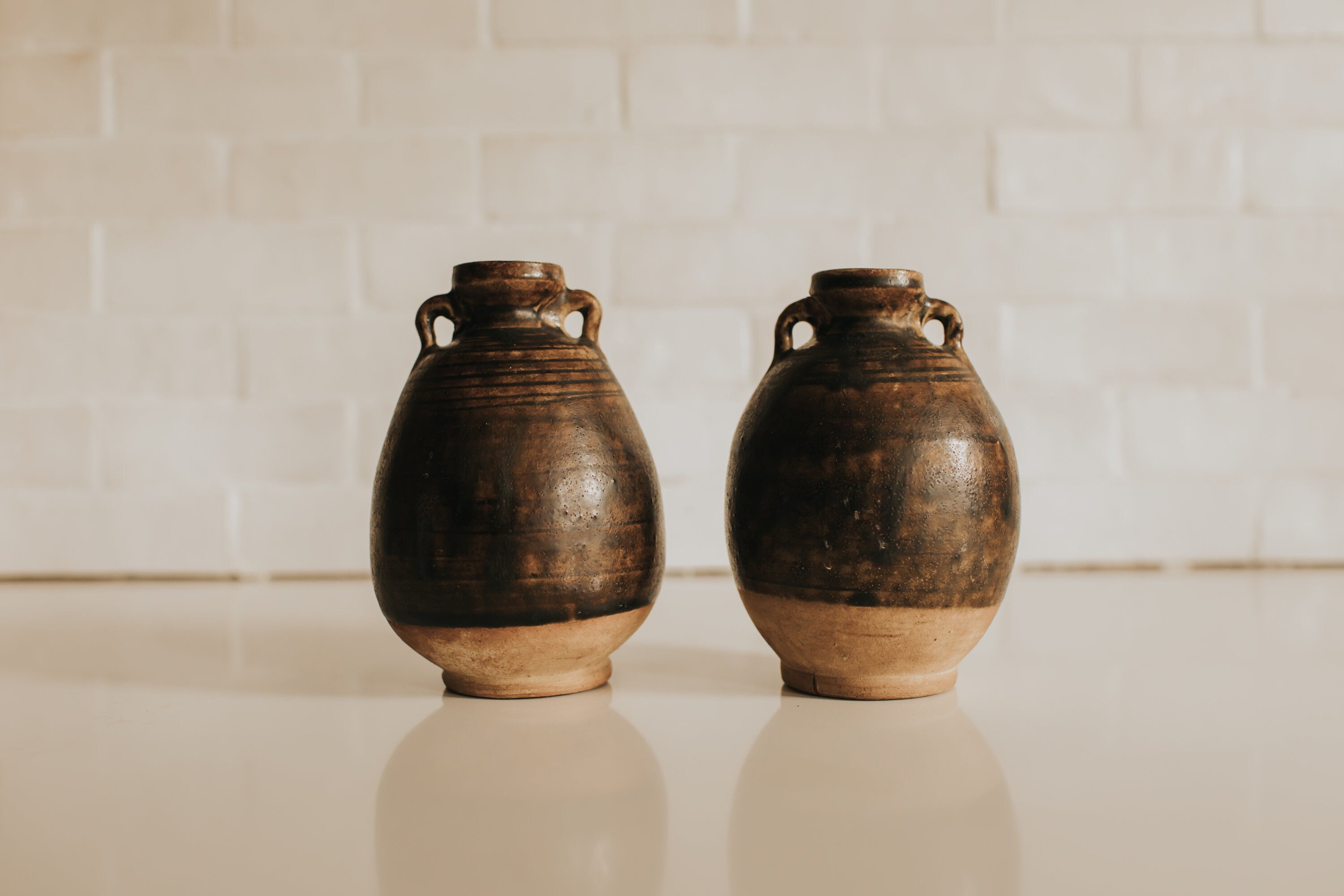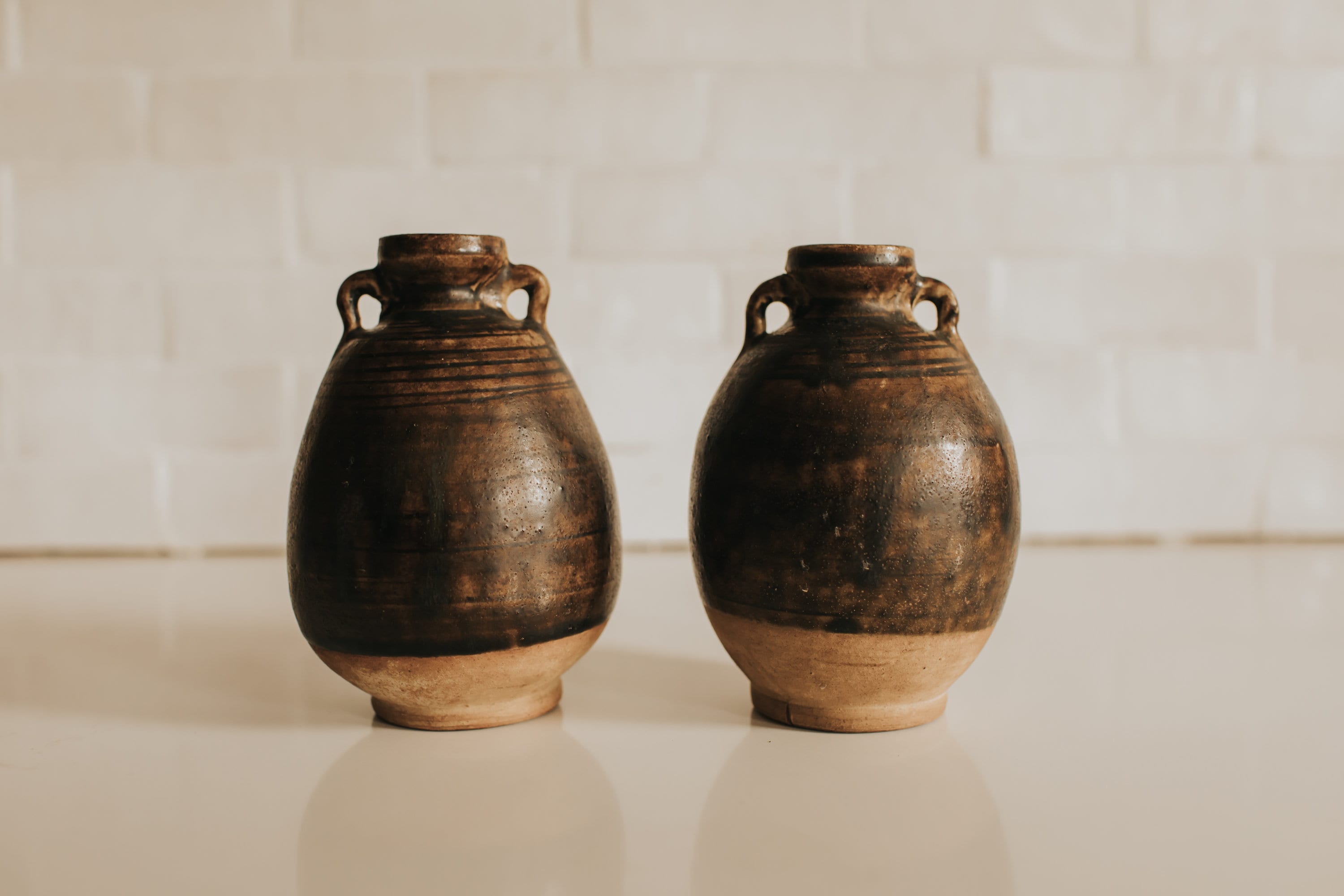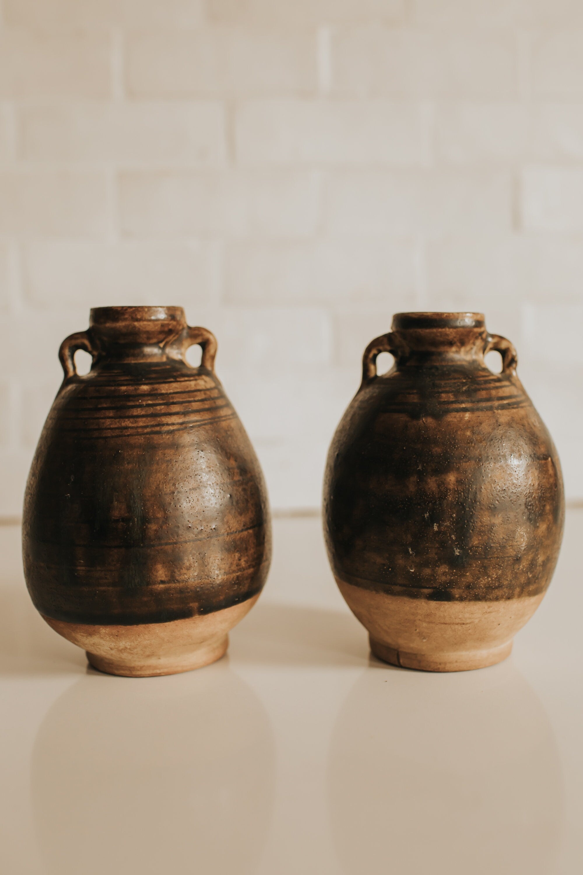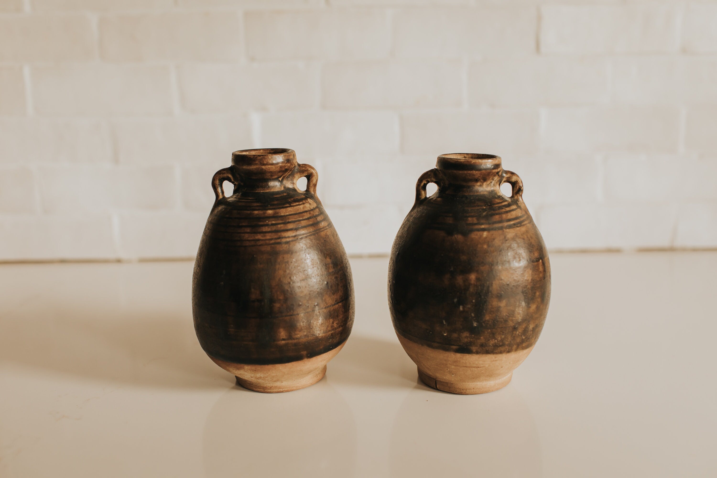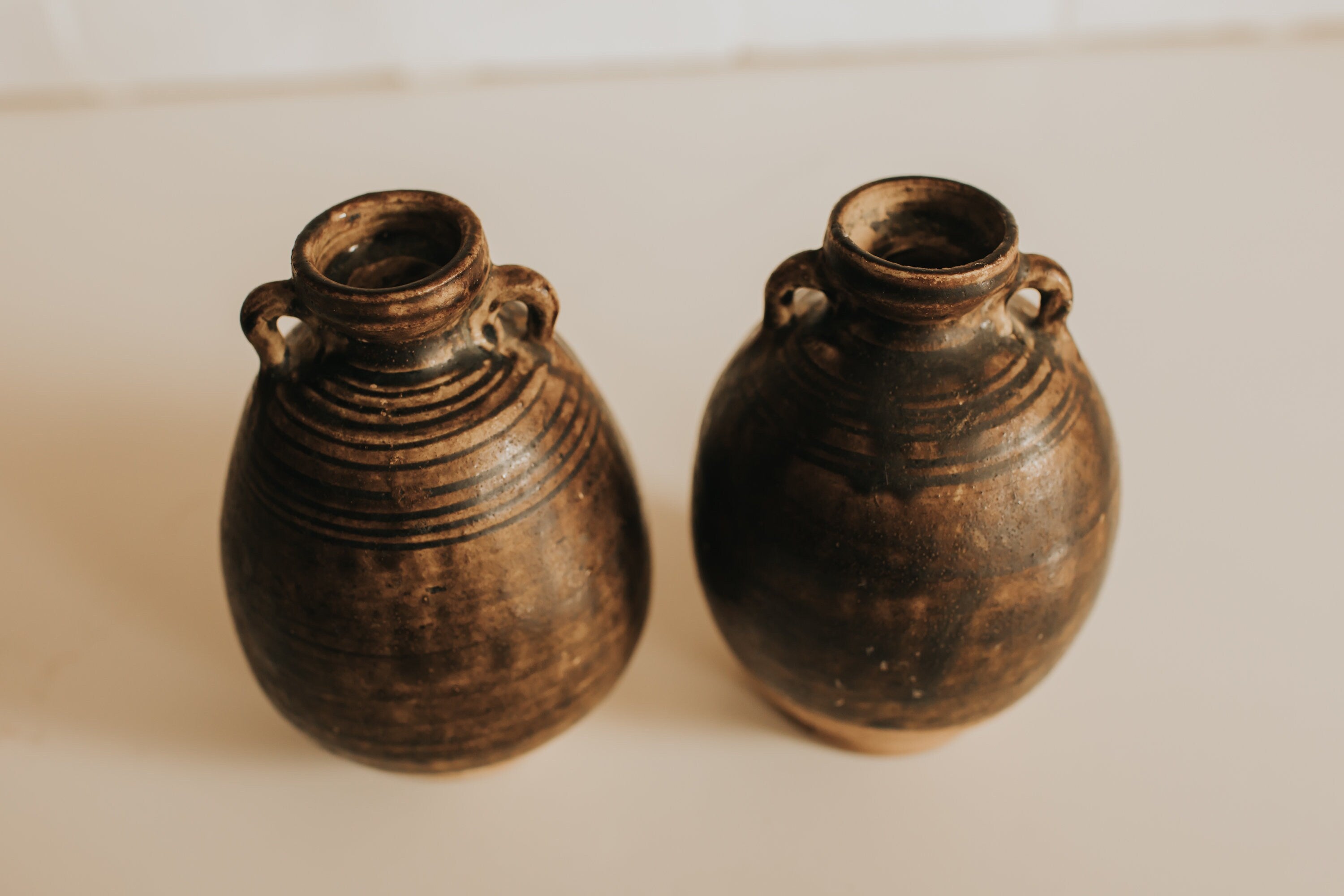 Antique Sawankhalok, Thailand pair of Small Ceramic Bottles / Vases with Lugs, Iron Glaze,