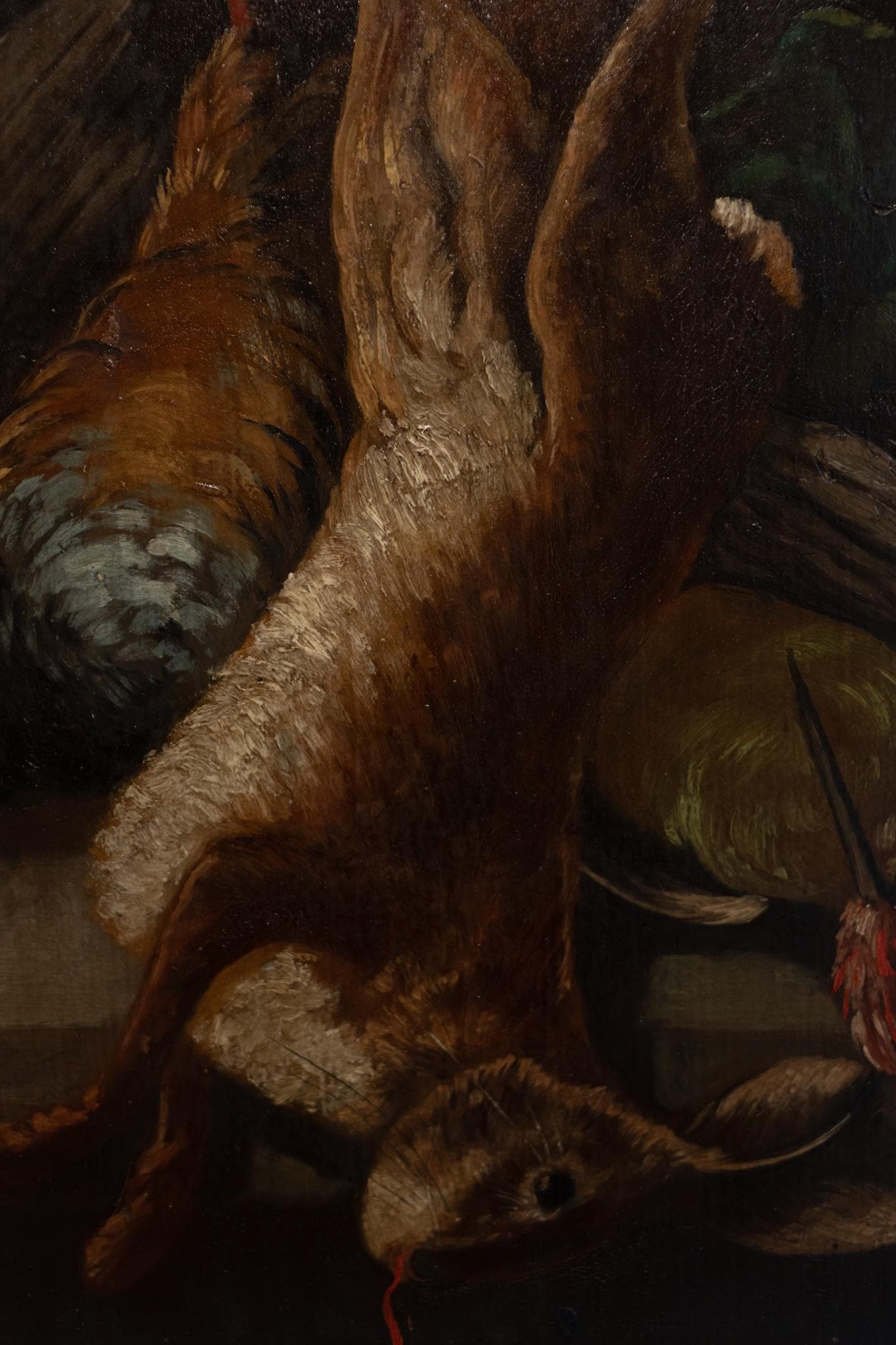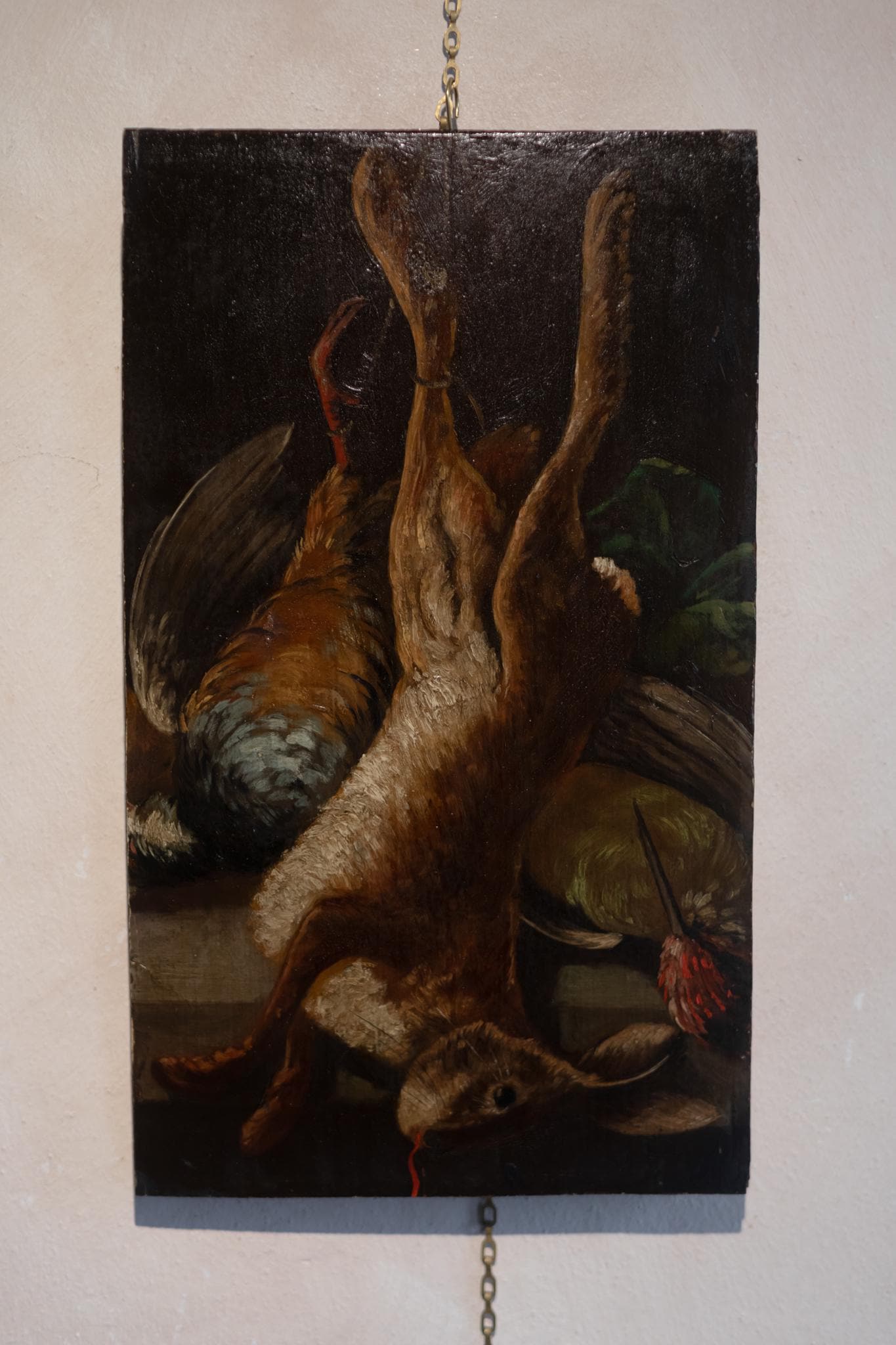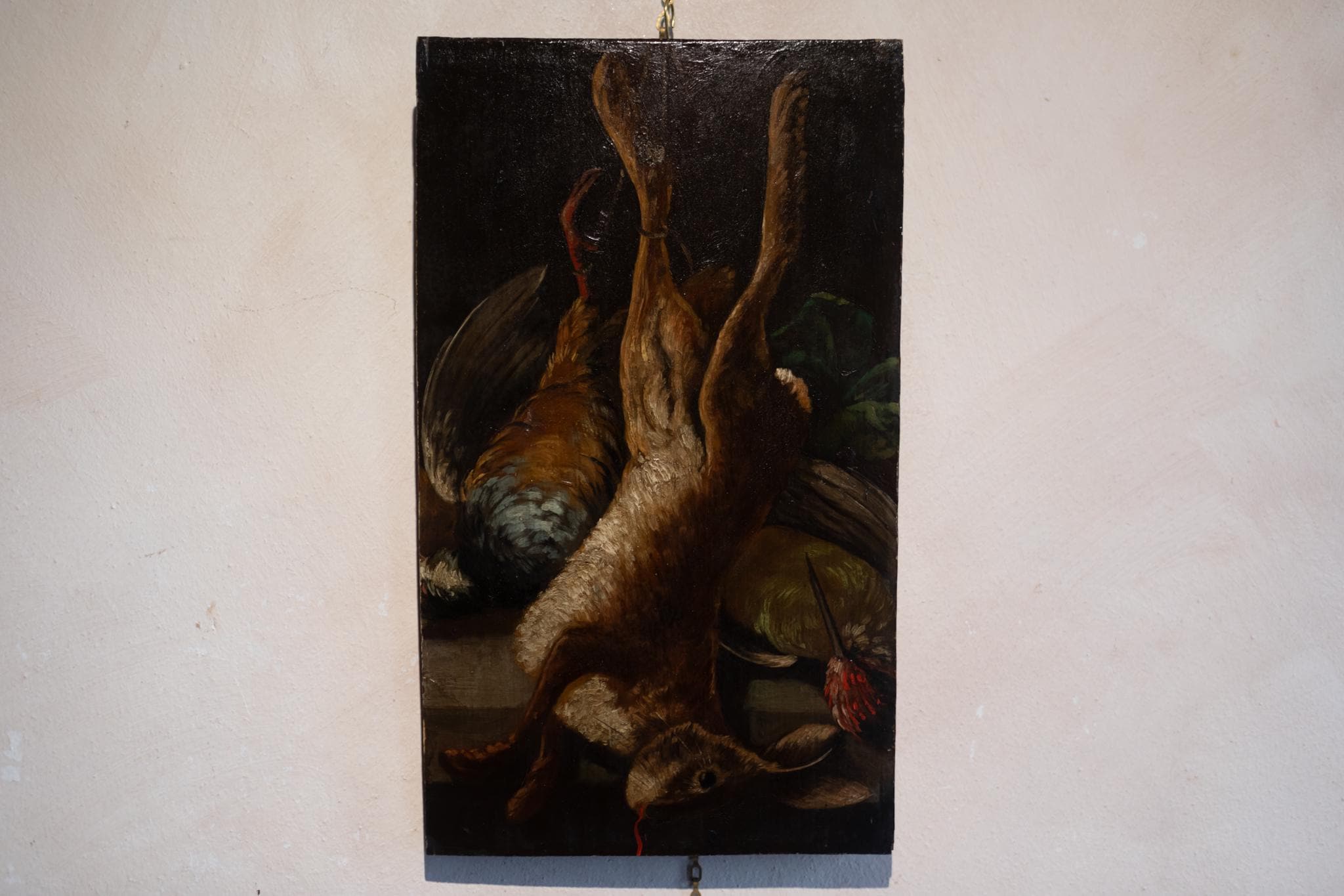 Dating from the 17th/18th century, a lovely French Antique Still Life / Hunting Scene. This antique oil painting is unframed on thick oak panel depicts a traditional French or Flemish hunting still life, dating to the late 17th or early 18th century. A hare and game birds hang after the hunt, rendered with bold light against a dark background in the dramatic Baroque style. Such works, known as natures "mortes de chasse", were popular in noble homes and hunting lodges, symbolising both abundance and mortality. Unsigned, the painting reflects the hand of a provincial workshop, with rich texture and strong chiaroscuro. A striking and atmospheric piece of early European still life art.