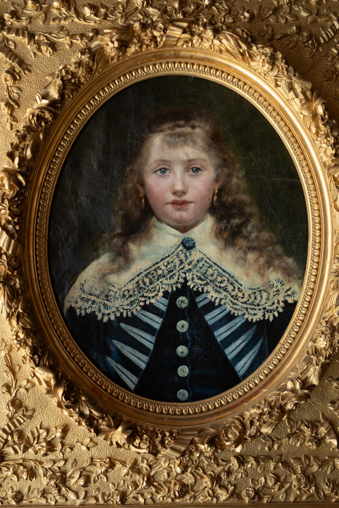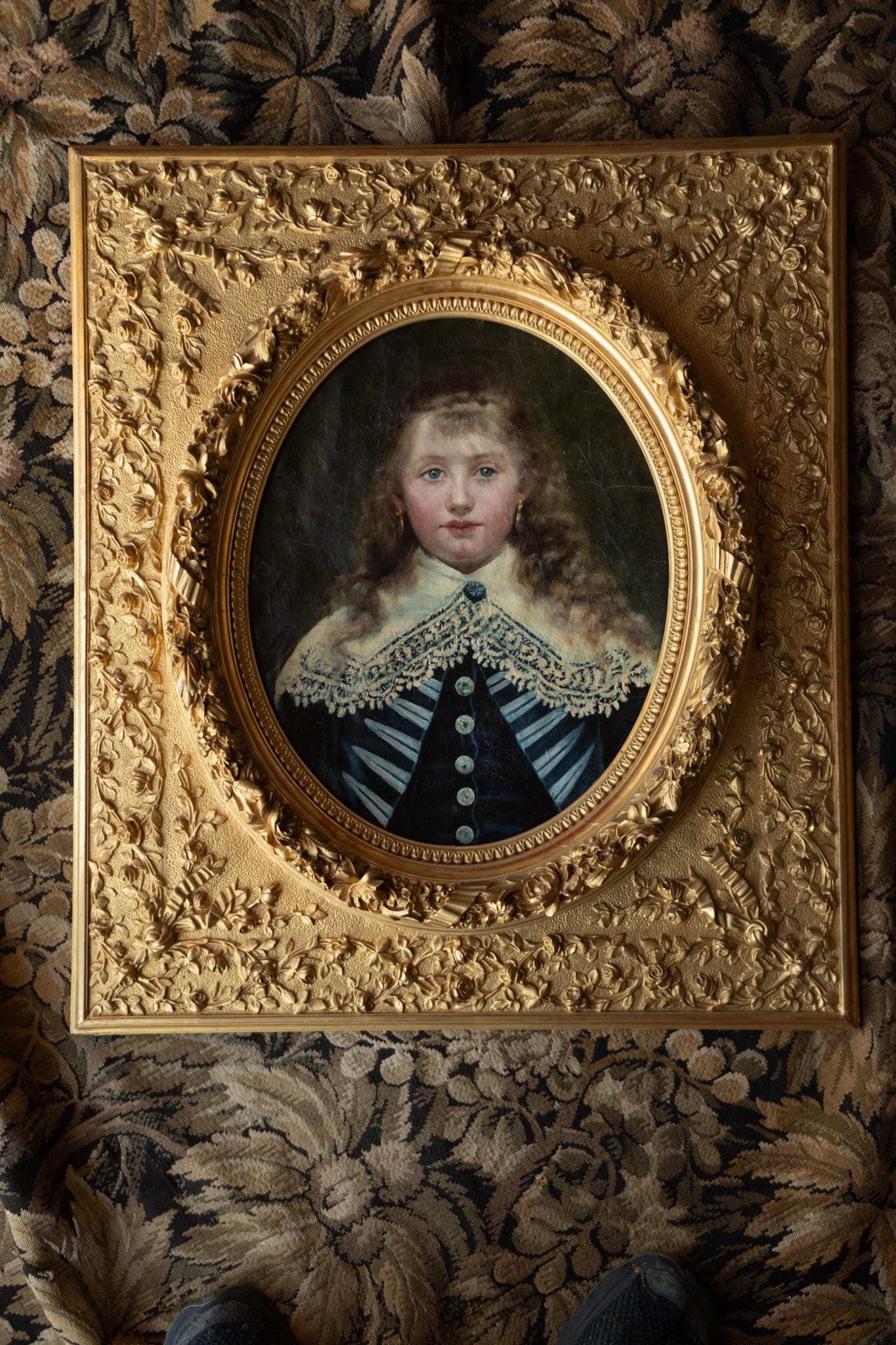 A beautiful, larger sizes portrait (26 inch or 65cm), circa 1860 French portrait of a young girl wearing traditional Breton lace. Painted with exquisite delicacy and presented in an extraordinary sculpted gilt frame. A refined and atmospheric example of regional mid-19th-century French portraiture.