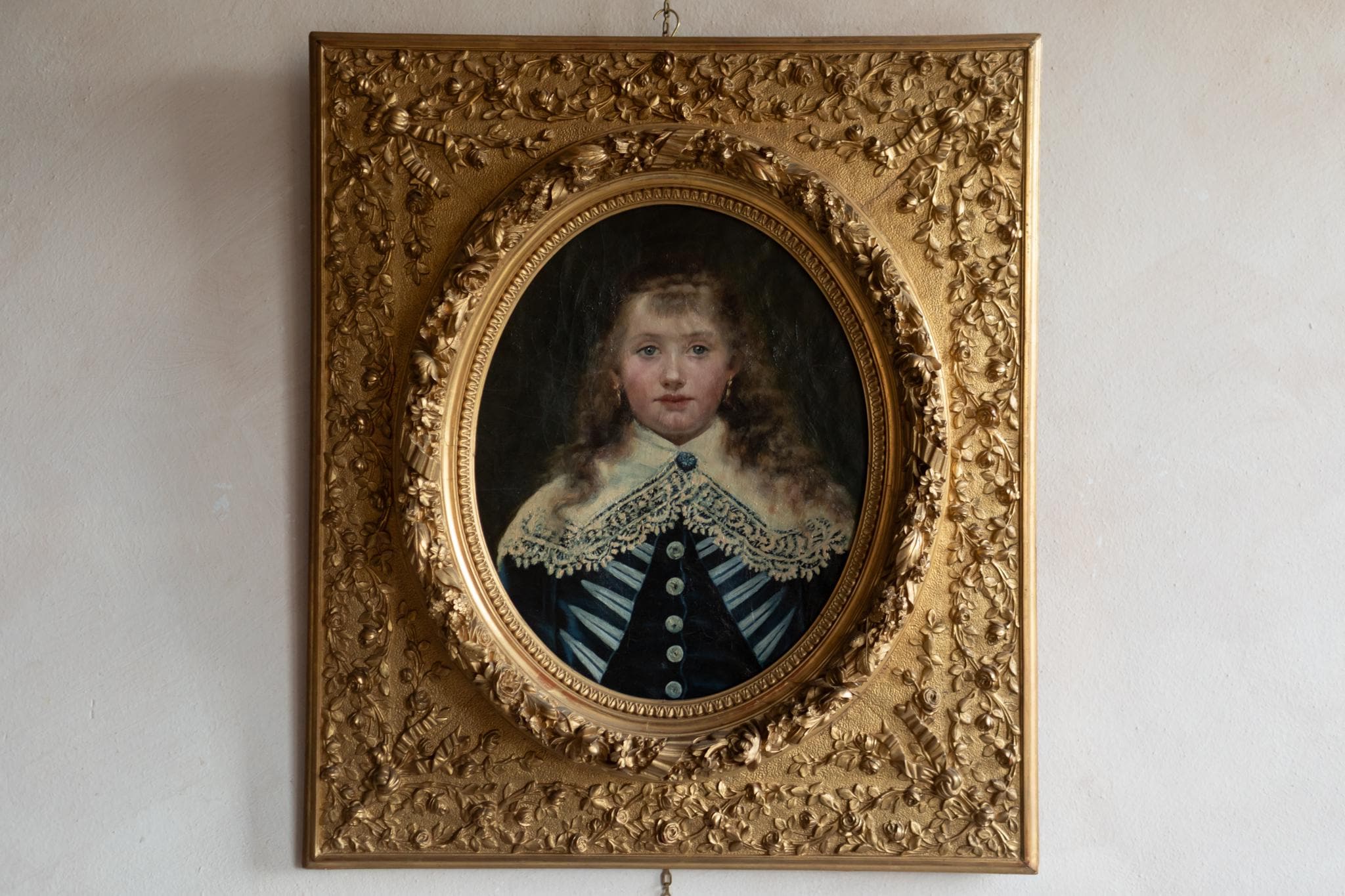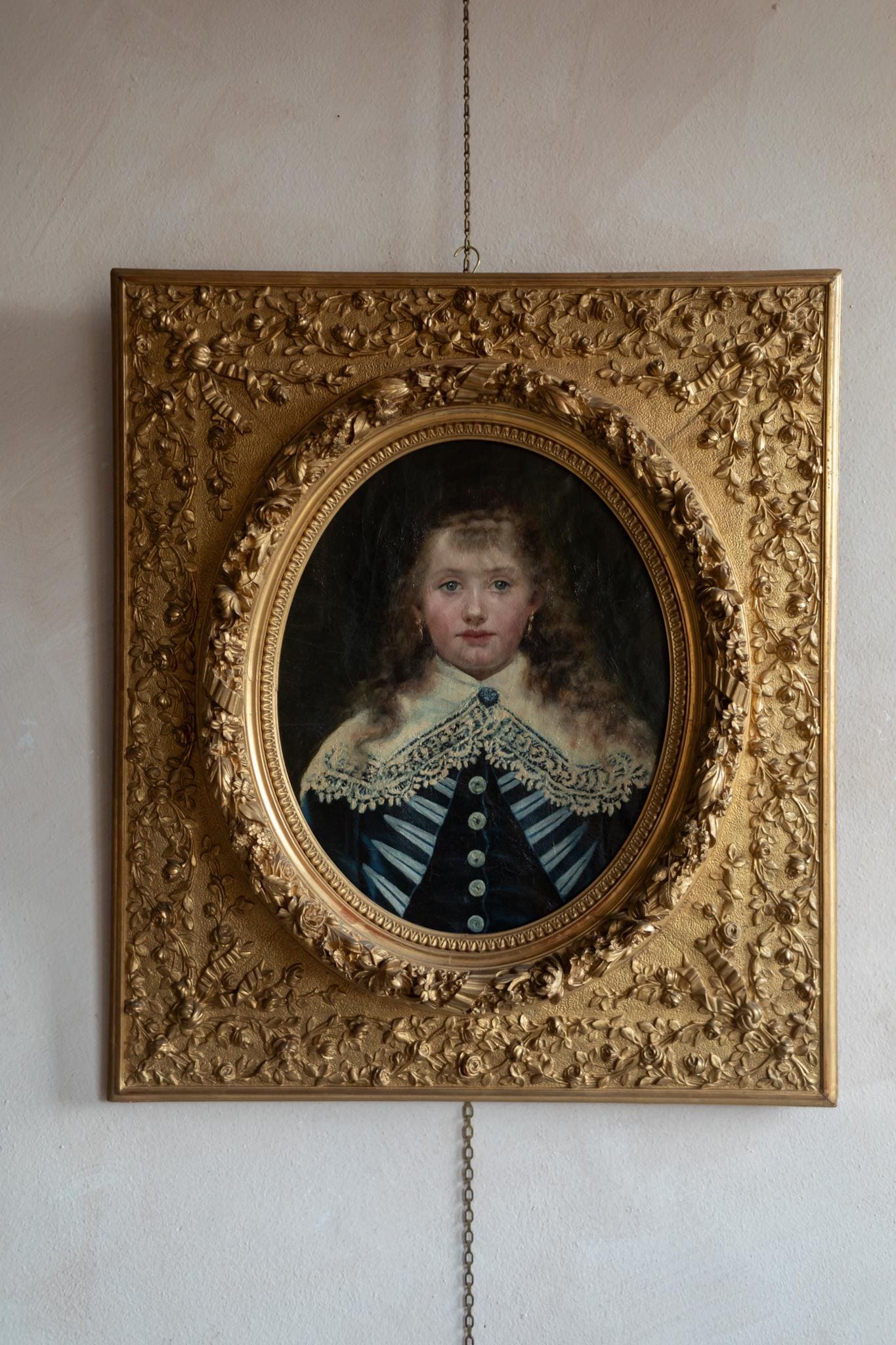 The painting is housed in its magnificent original gilt frame, richly carved with flowers, foliage and scrollwork, and featuring an inner oval moulding that enhances the softness of the sitter’s face. Frames of this caliber rarely survive intact with their original portraits, making this example particularly special.
