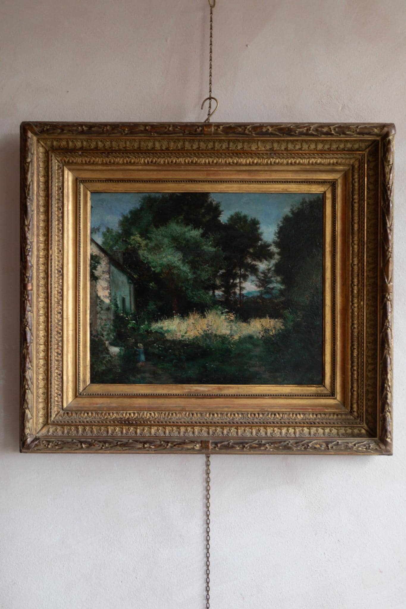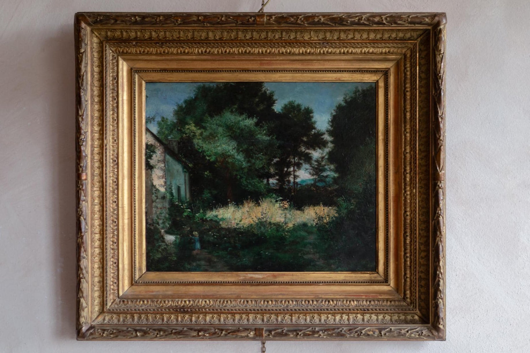 The artist’s brushwork is expressive yet controlled, dense foliage rendered with layered greens and blues, the sky glimpsed between branches, and soft details that lead the eye through the shaded path toward the open landscape beyond. Though the painting no longer carries its signature, the painting clearly belongs to the tradition shaped by Corot, Daubigny, and the later plein-air painters who valued mood, natural light, and poetic simplicity over academic precision.