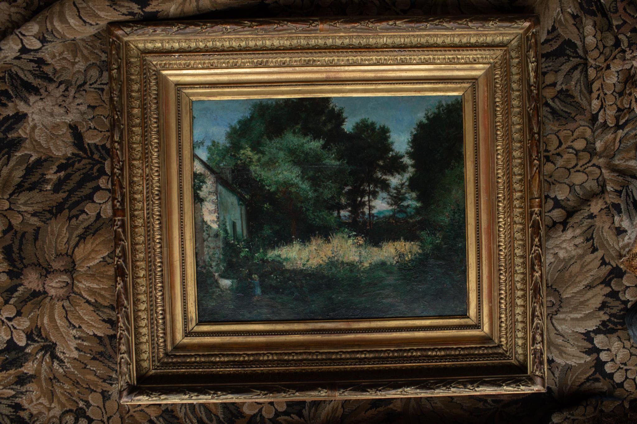 This striking Barbizon landscape captures a quiet clearing beside an old stone building, where sunlight breaks through the trees and spills across tall grasses. A little girl standing next to the farm with her goat, embracing the summer on the farm. The contrast between deep forest shadow and bright golden vegetation is handled with remarkable confidence, the kind of tonal sensitivity associated with the Barbizon painters of the mid-to-late 19th century.