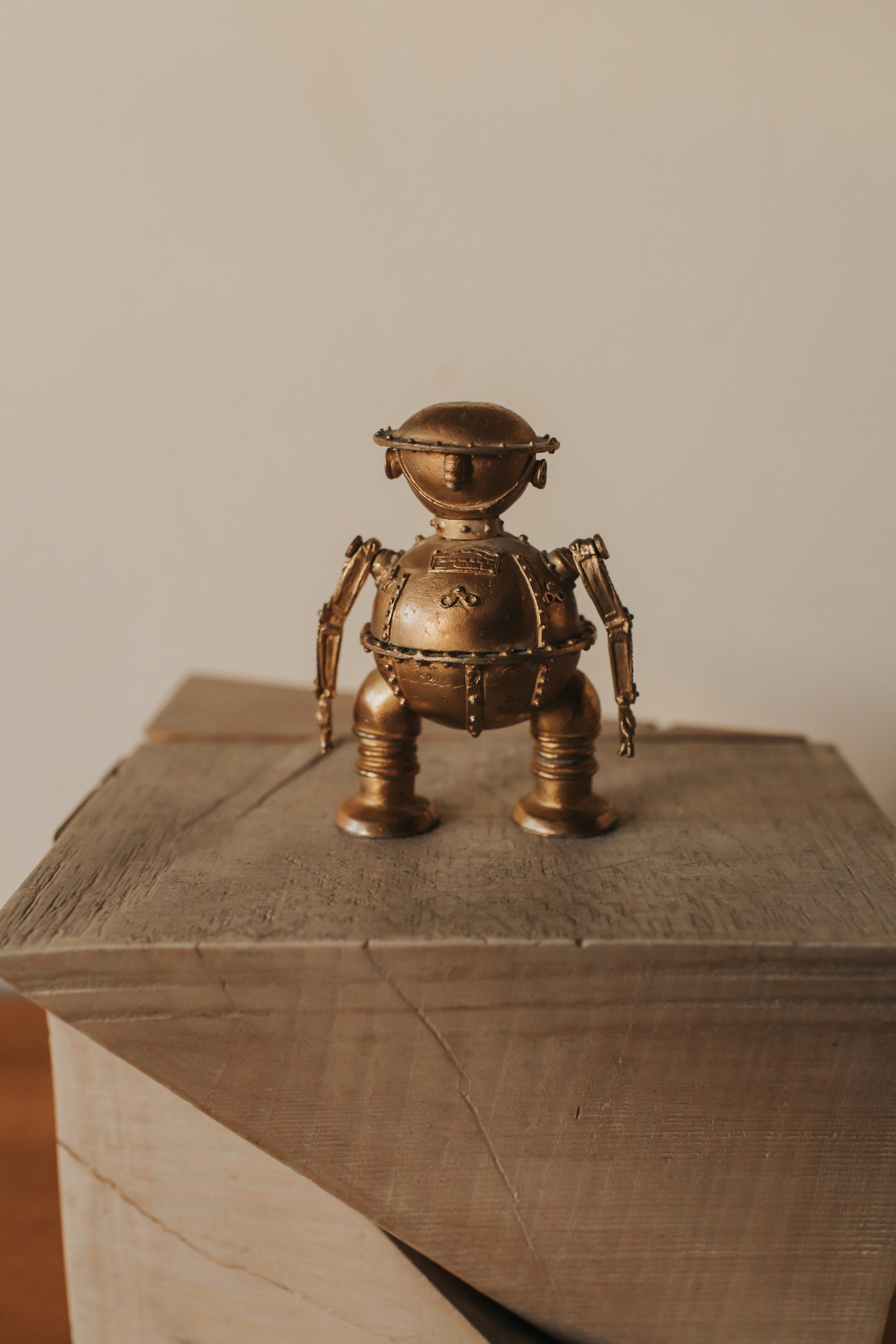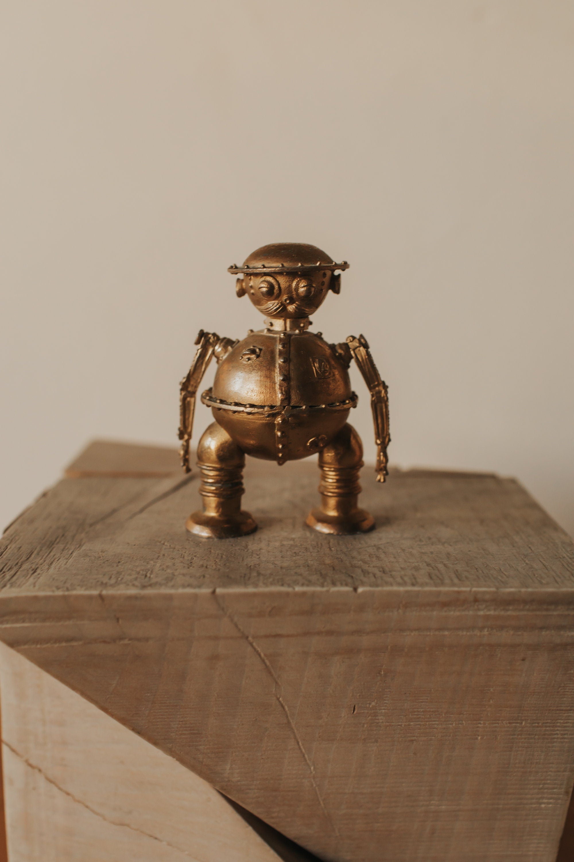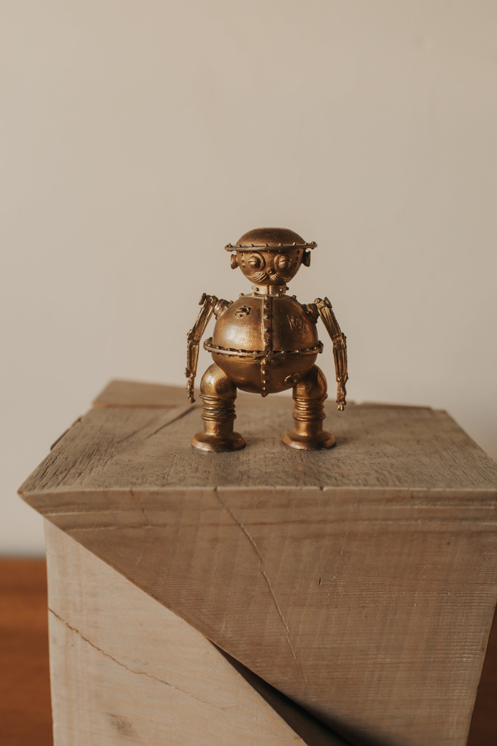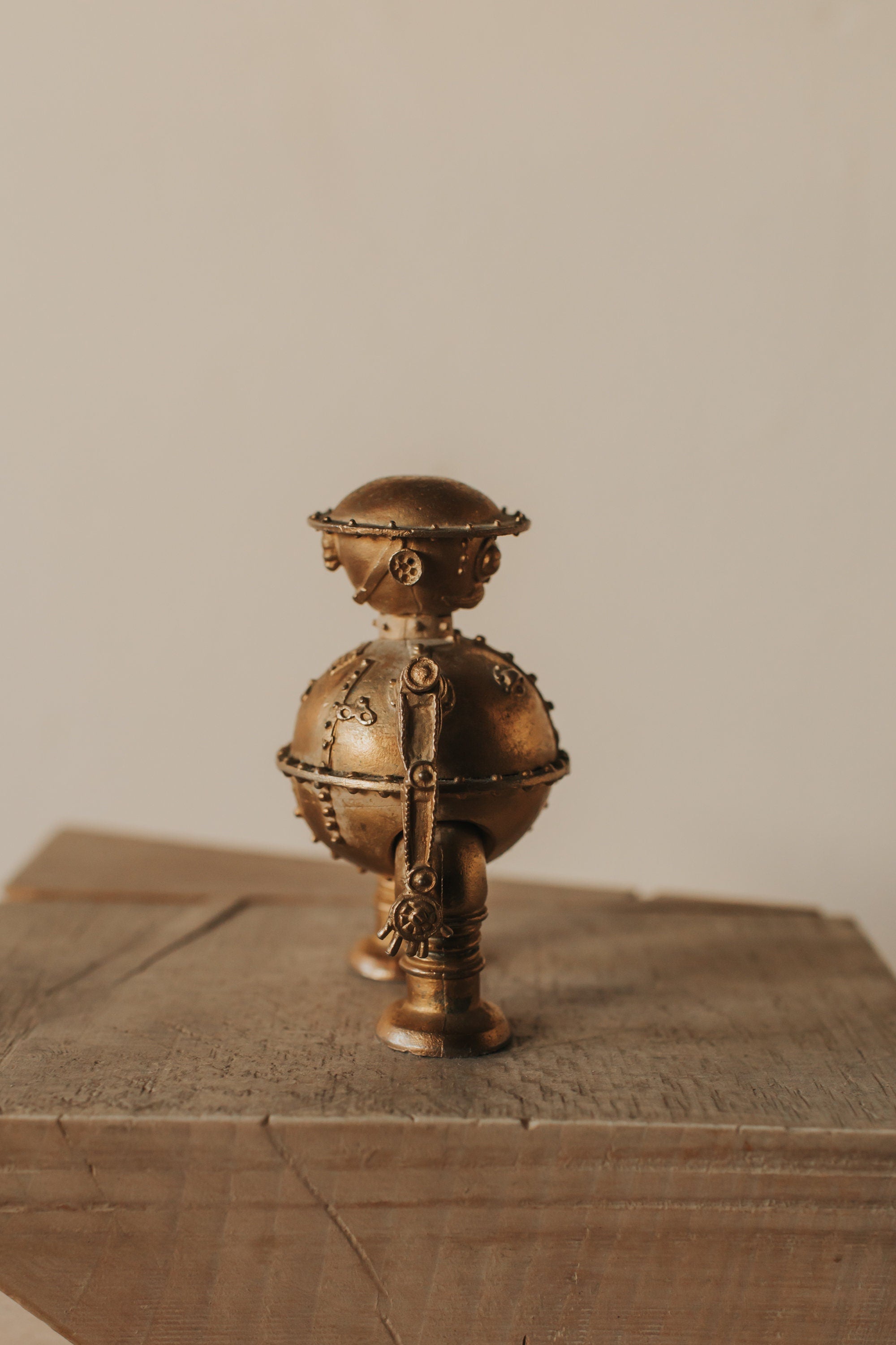 This miniature mechanical man has great intricate detailing and is made from faux-gold plated metal. You can see from the photos, the cast is of excellent quality as rivets across his round torso, moustache, and his rounded tin hat have been paid close attention to by the maker. Screws have been set through arms made separately, allowing the arms to move freely backwards/forwards.