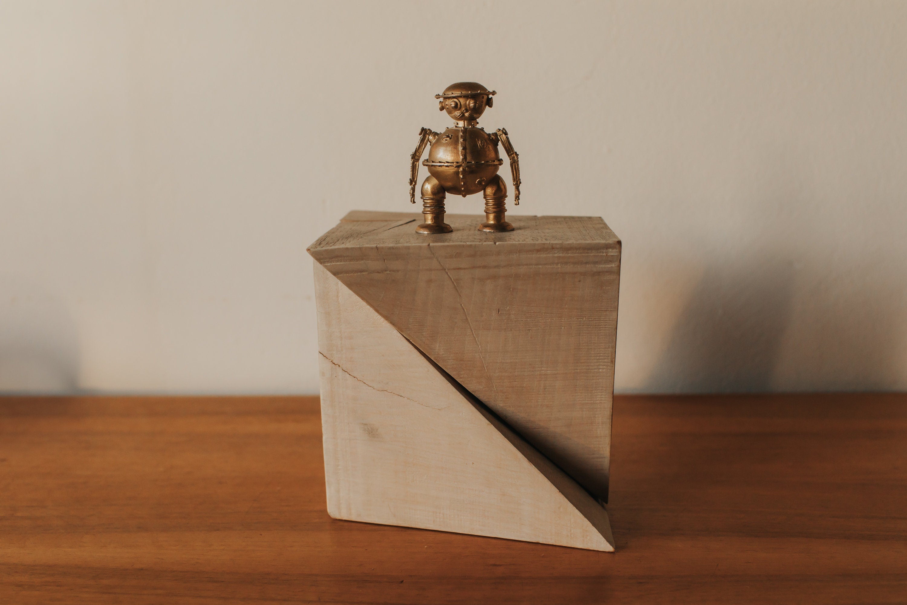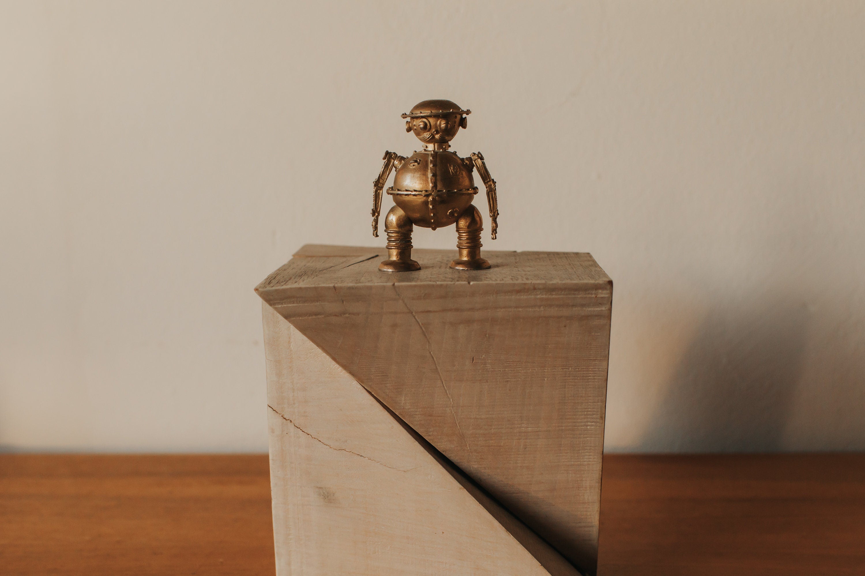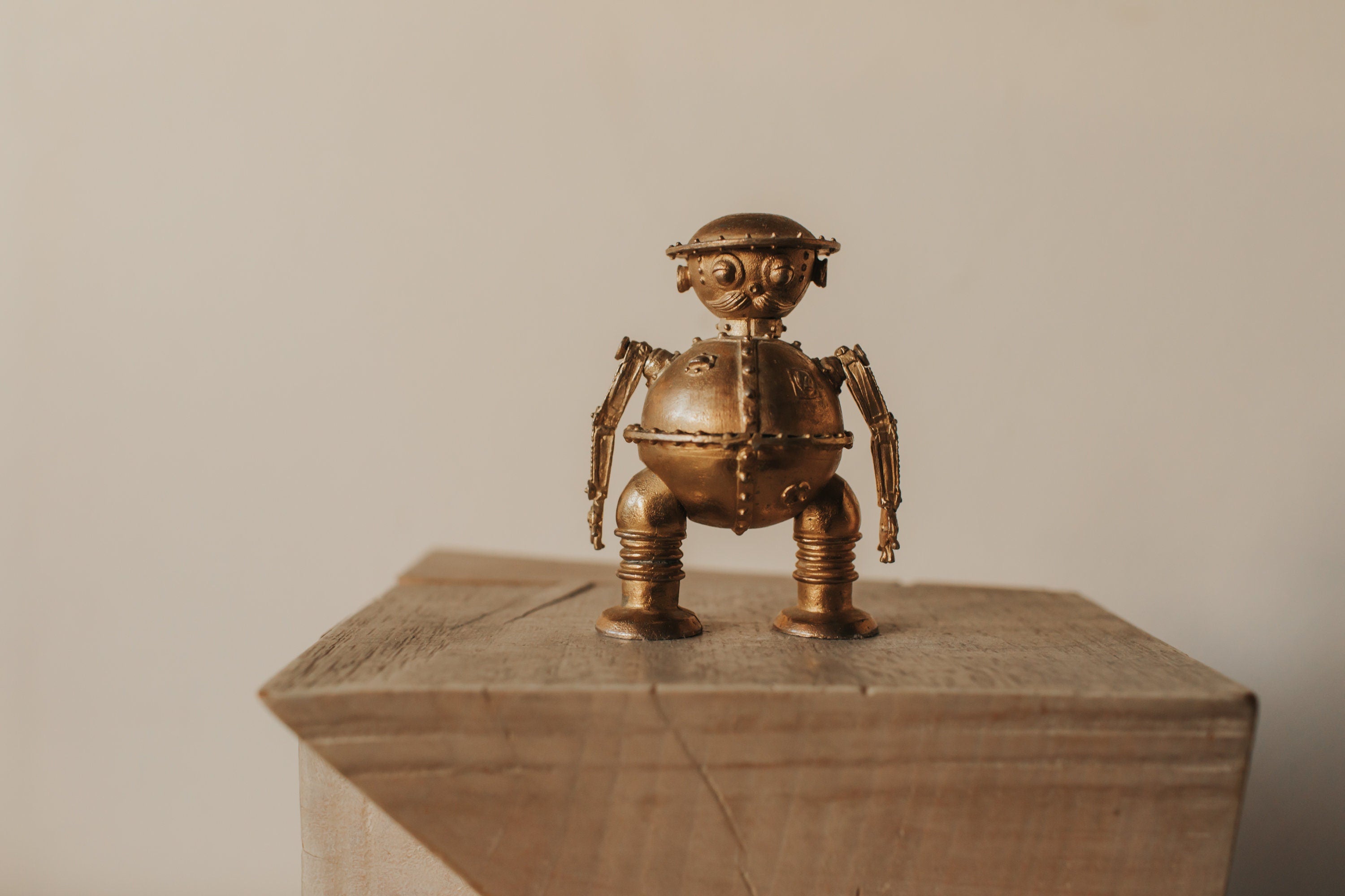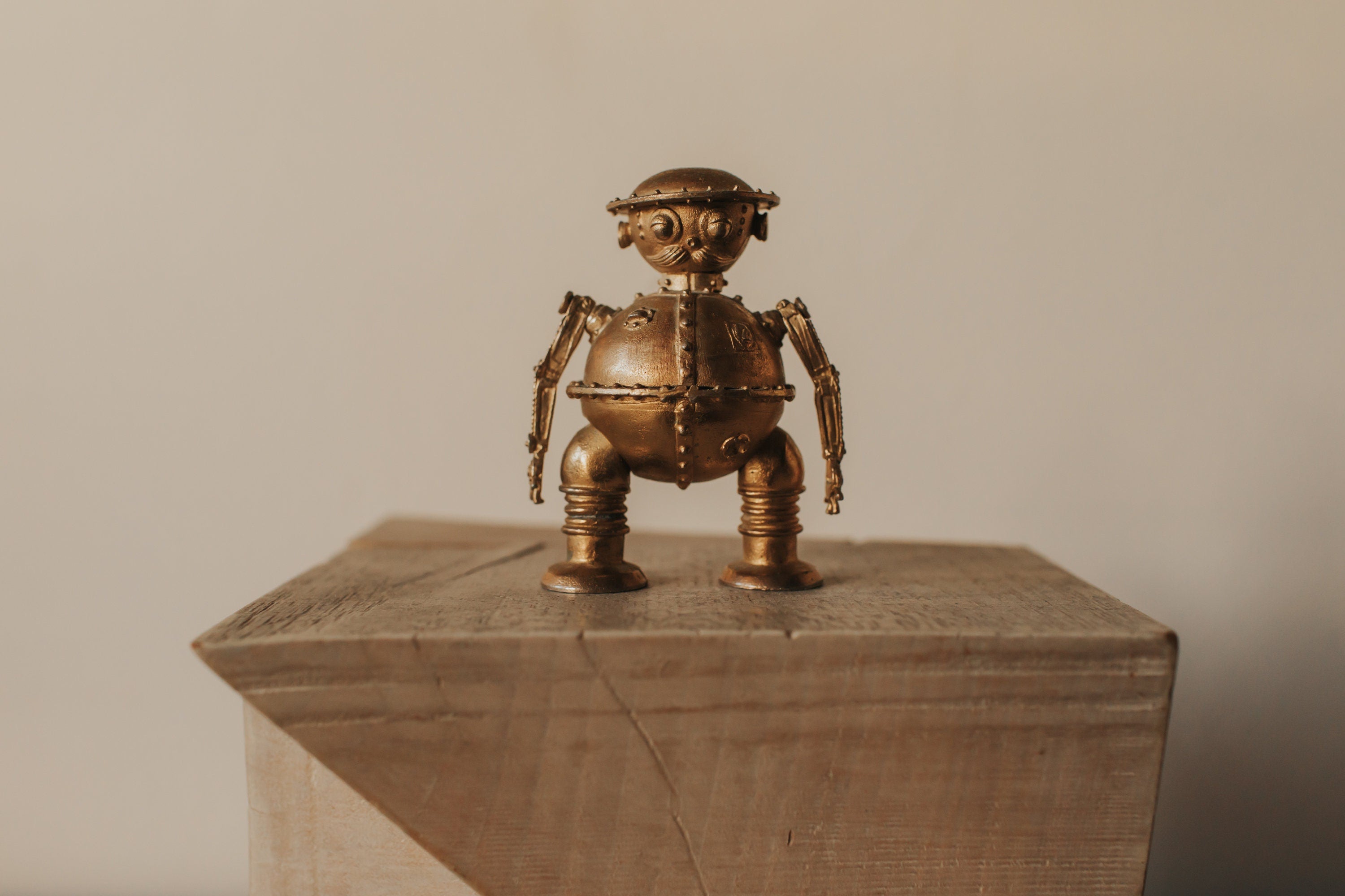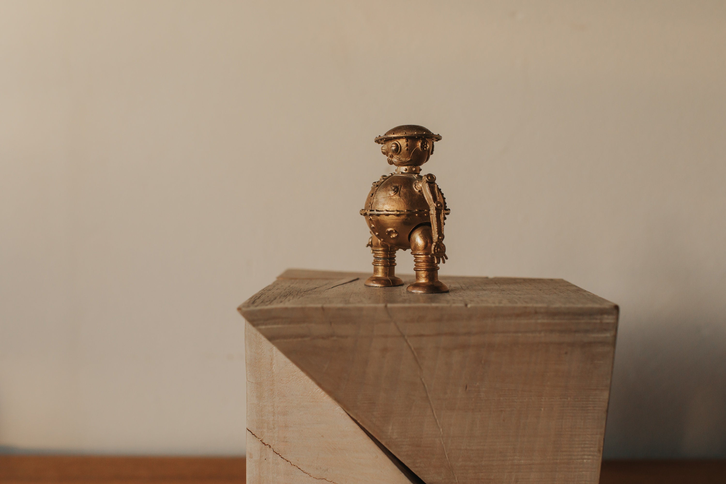 This miniature mechanical man has great intricate detailing and is made from faux-gold plated metal. You can see from the photos, the cast is of excellent quality as rivets across his round torso, moustache, and his rounded tin hat have been paid close attention to by the maker. Screws have been set through arms made separately, allowing the arms to move freely backwards/forwards.
