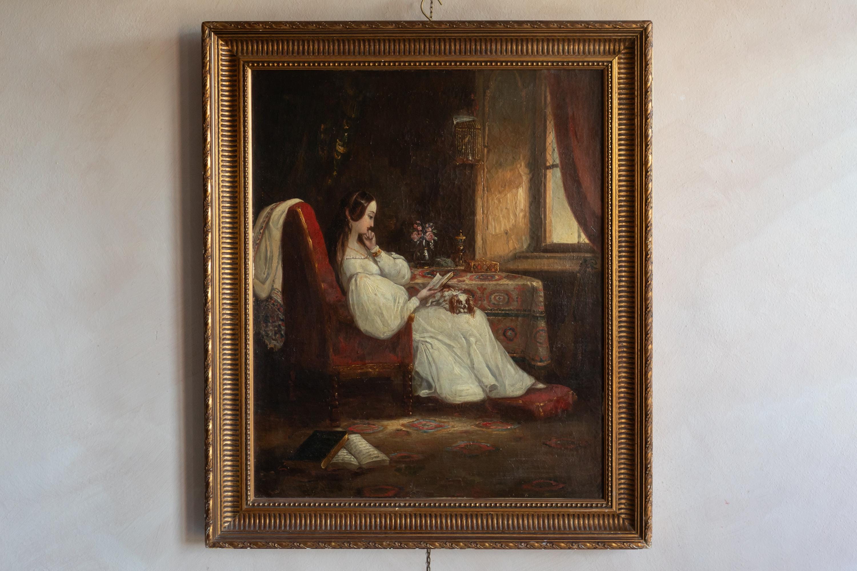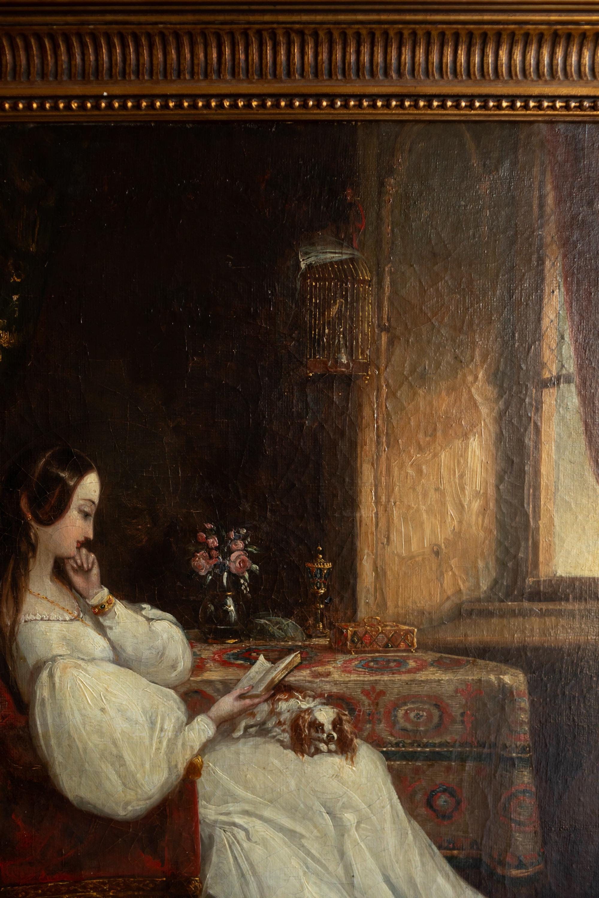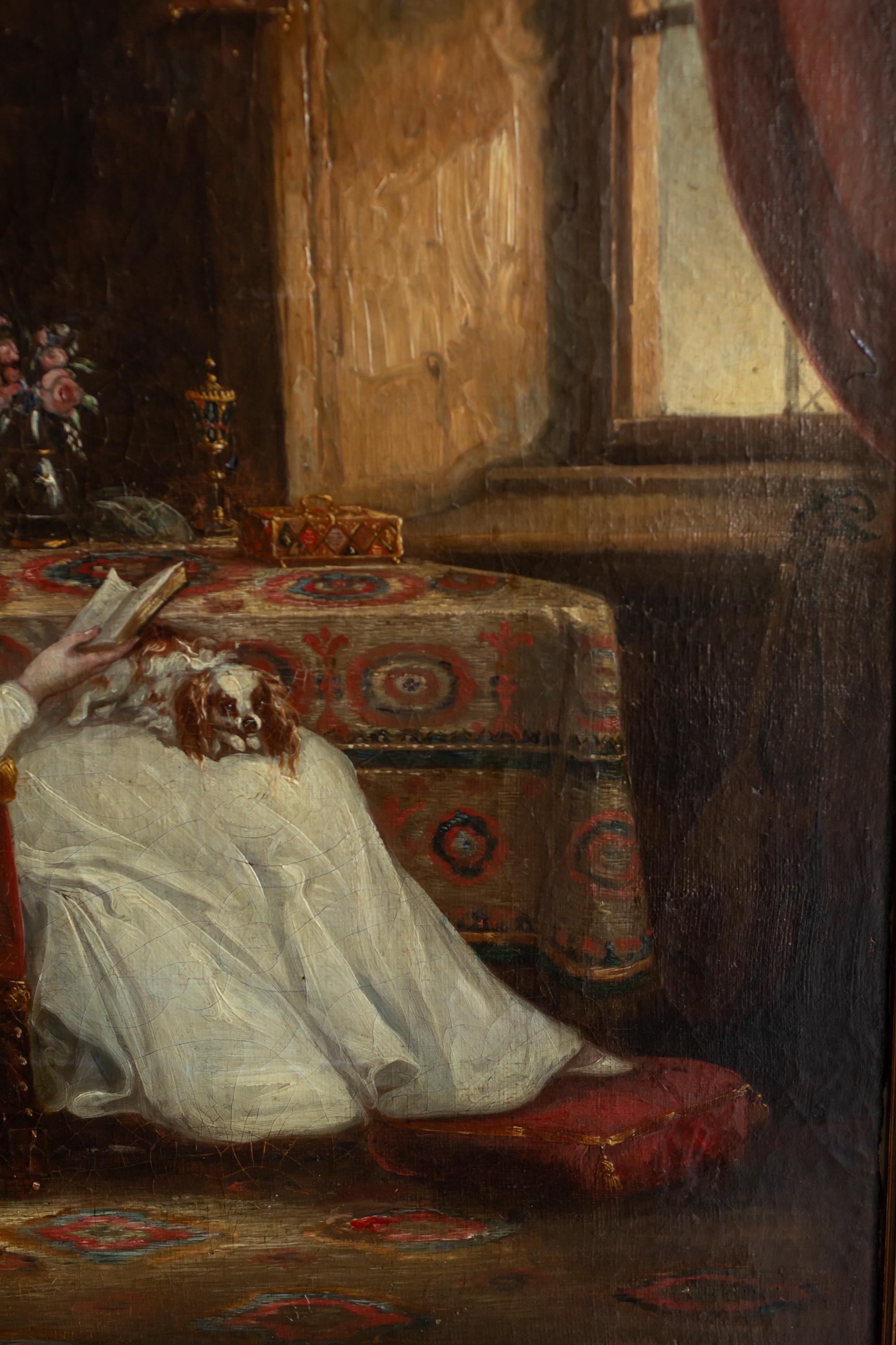 A 19th Century large portrait painting of a woman and her dog. Lovely details in the room. This antique piece is oil paint on canvas. Its been restored and relined. Due to its age it does have some craquelure but is in overall good condition. This painting has undergone extensive restoration and has been fully re-canvased and placed back on the original stretcher. The details of this painting are amazing and is certainly a statement piece in any home. This painting is unsigned.