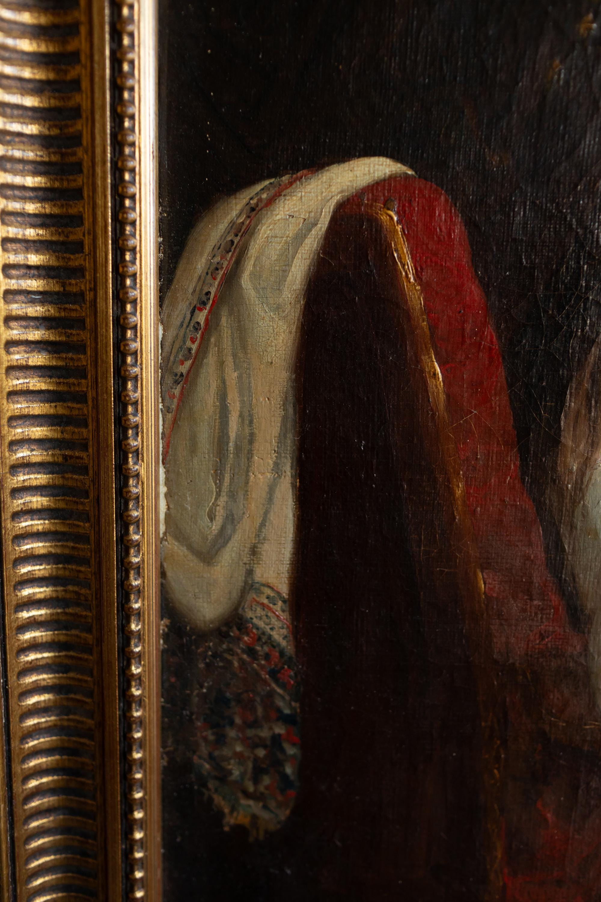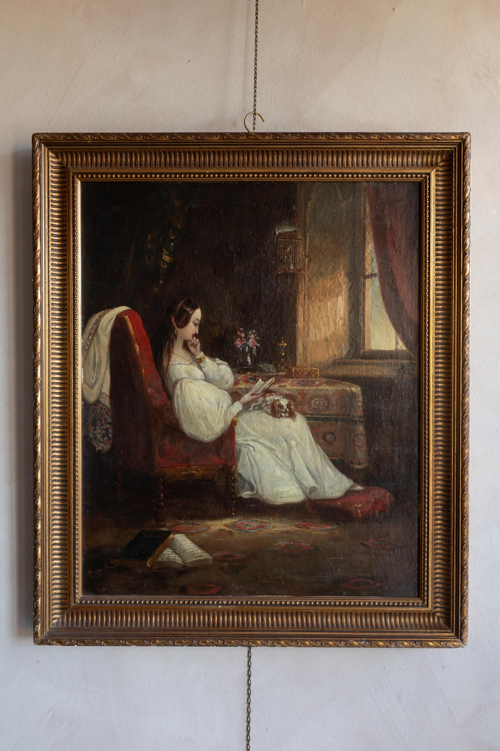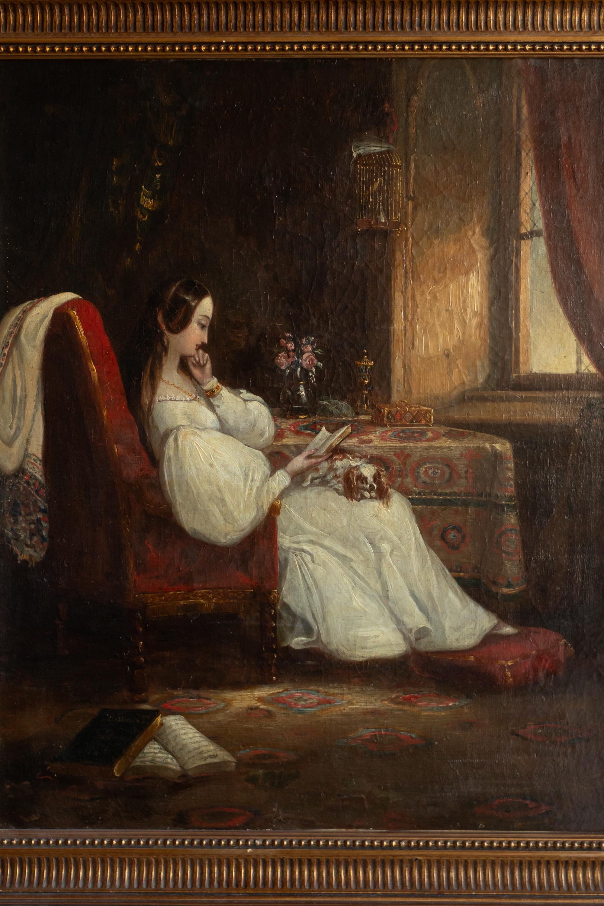 A 19th Century large portrait painting of a woman and her dog. Lovely details in the room. This antique piece is oil paint on canvas. Its been restored and relined. Due to its age it does have some craquelure but is in overall good condition. This painting has undergone extensive restoration and has been fully re-canvased and placed back on the original stretcher. The details of this painting are amazing and is certainly a statement piece in any home. This painting is unsigned.